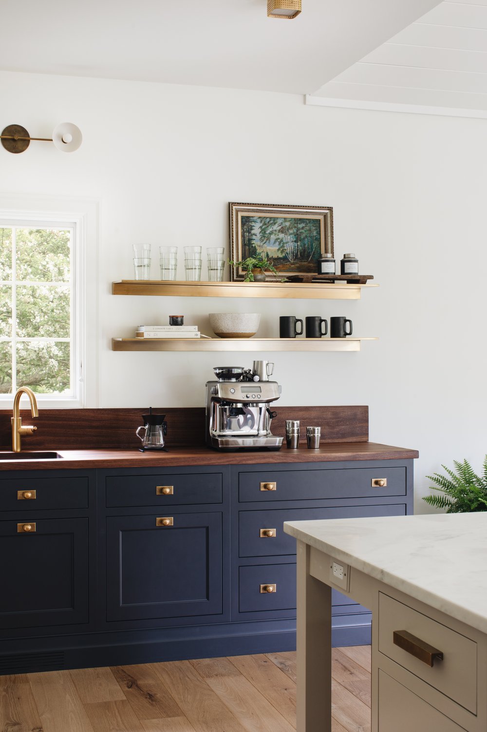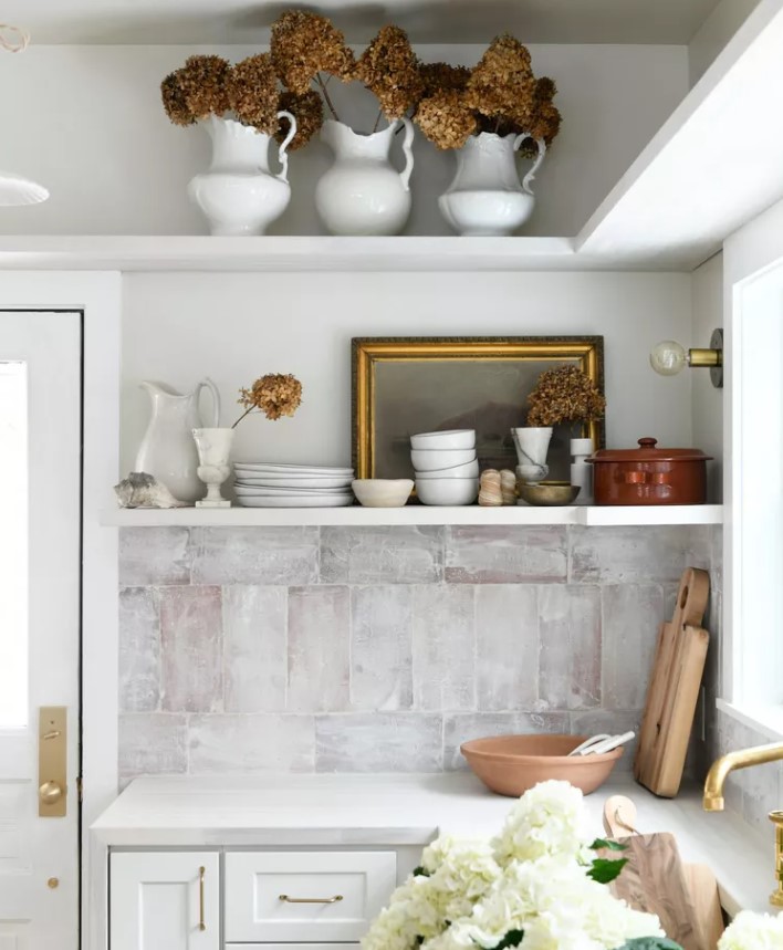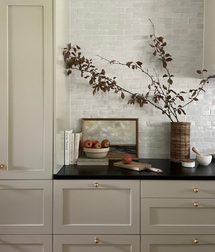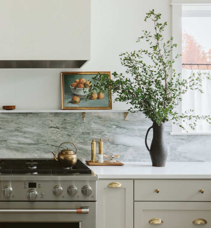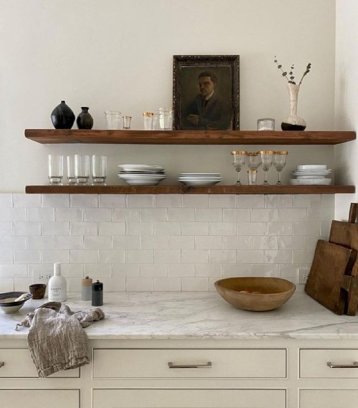 Ever since open shelves became a timeless addition to a kitchen, people look to fill the vertical area between or above shelves with pleasing elements, this is where one or two pieces of framed art helps to draw the eye to the shelf scene. In addition to wood cutting boards, art can be used on the countertop to disguise electric plugs on the walls so the backsplash feels uninterrupted.
