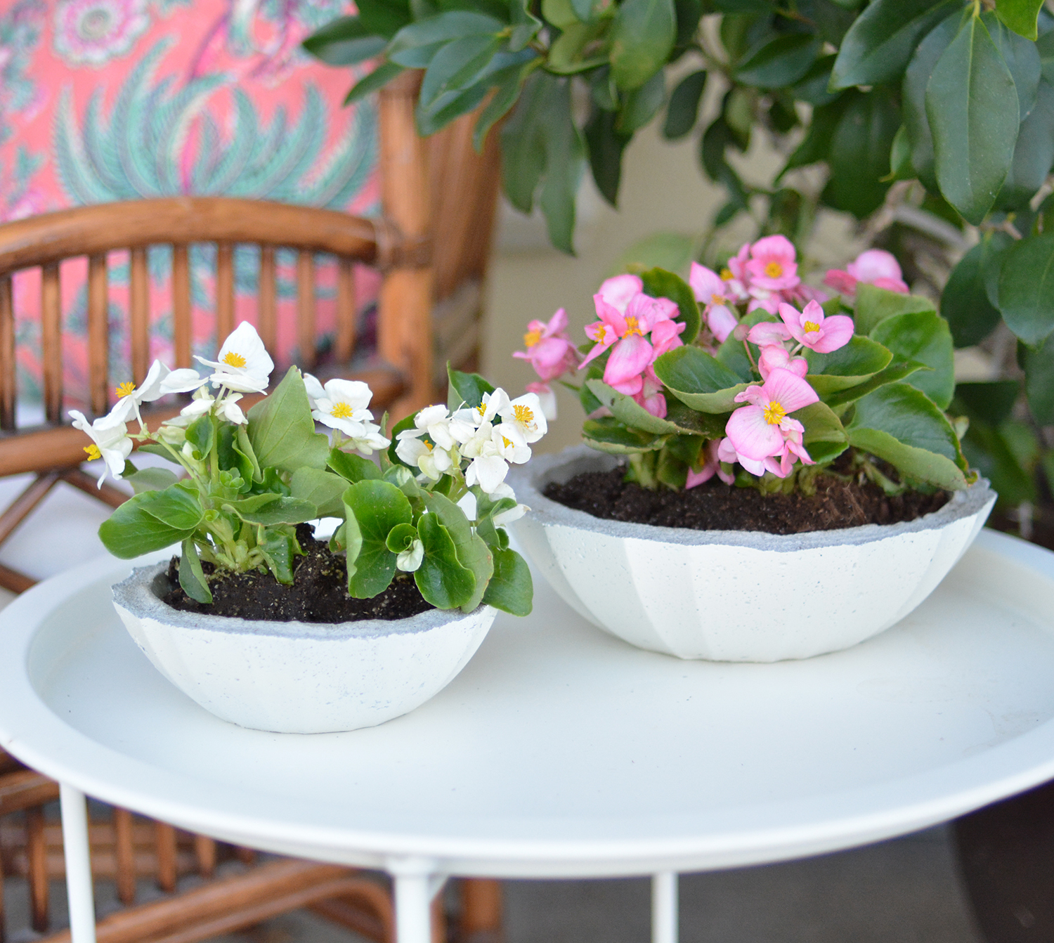 These planters you can create in one afternoon, they’re simple to make with small amounts of cement and make unique tabletop planters for flowers or succulents. Spring has arrived here in California so this was the perfect little project to add some seasonal annuals to the front porch.