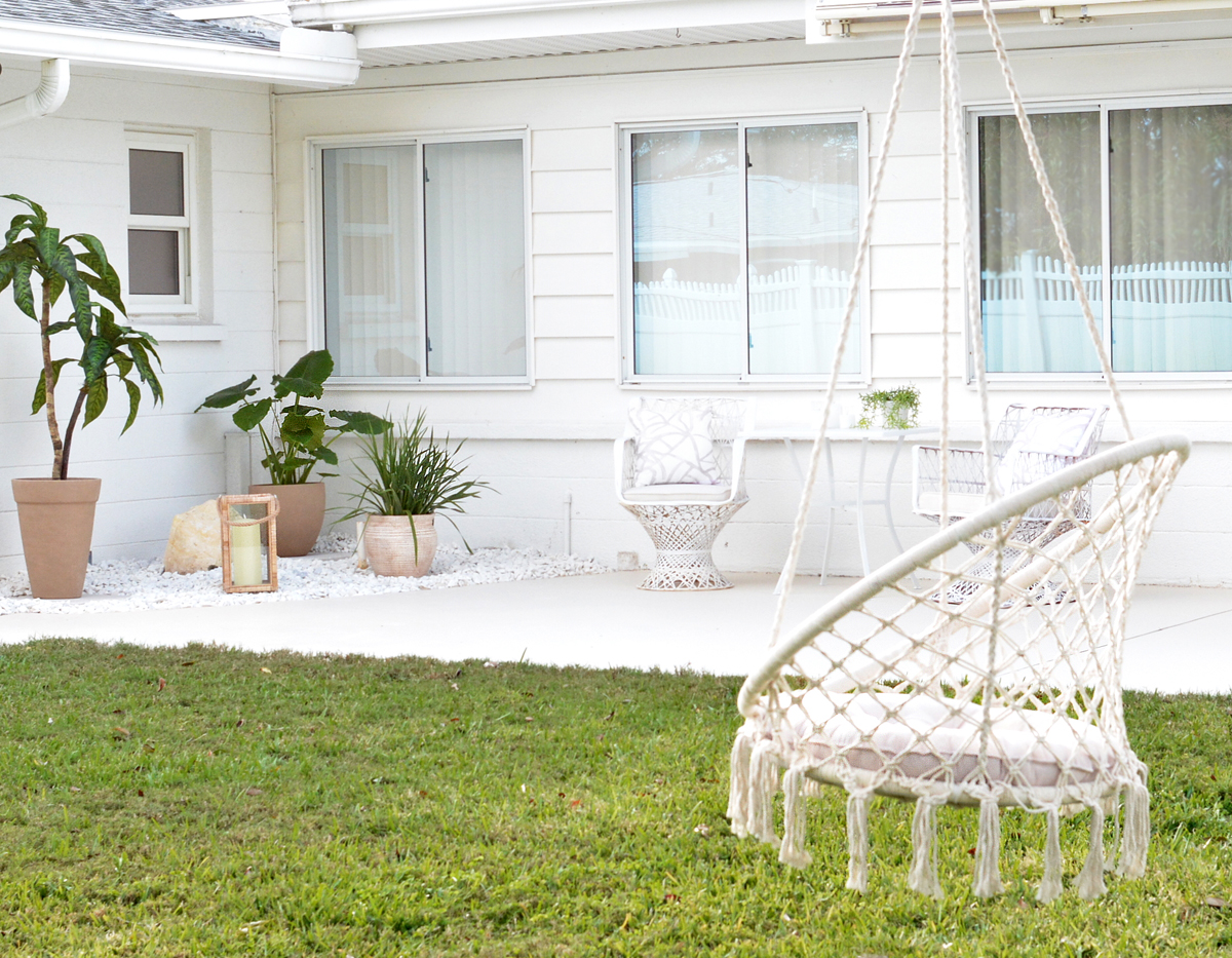 We’ve been slowly fixing up our house in Florida whenever we visit, and on my last stay earlier this month I gave the patio seating area a makeover. Anyone who’s lived in Florida is familiar with the weather patterns there: winters are sunny and mild, spring is perfection, summers are hot and humid, and it rains a ton in the fall. I didn’t want to tackle this project in high heat and humidity so I planned this outdoor update during the best time of year for it, and gave this corner of our patio a makeover while temperatures were in the mid 70s.