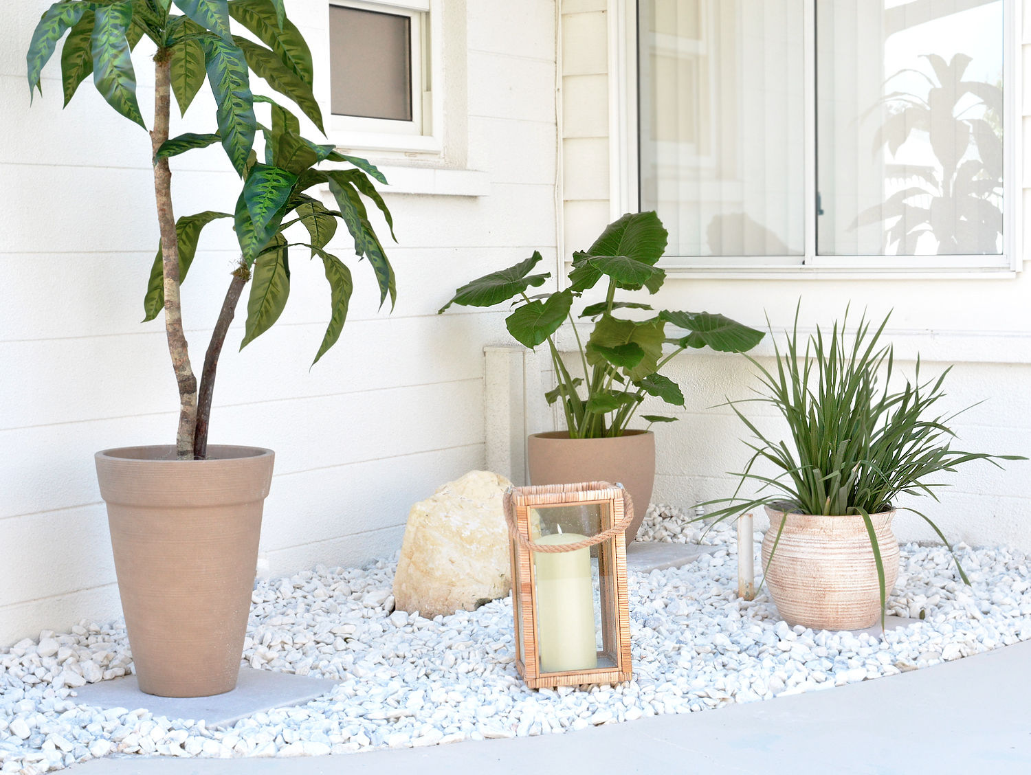I wrote about pale pebble landscape design ideas last year in anticipation of just this kind of makeover. These kinds of low maintenance rock beds with tropical plantings are common in the area, they also complement the style of our older home so I refreshed our sitting area landscaping in a similar style.