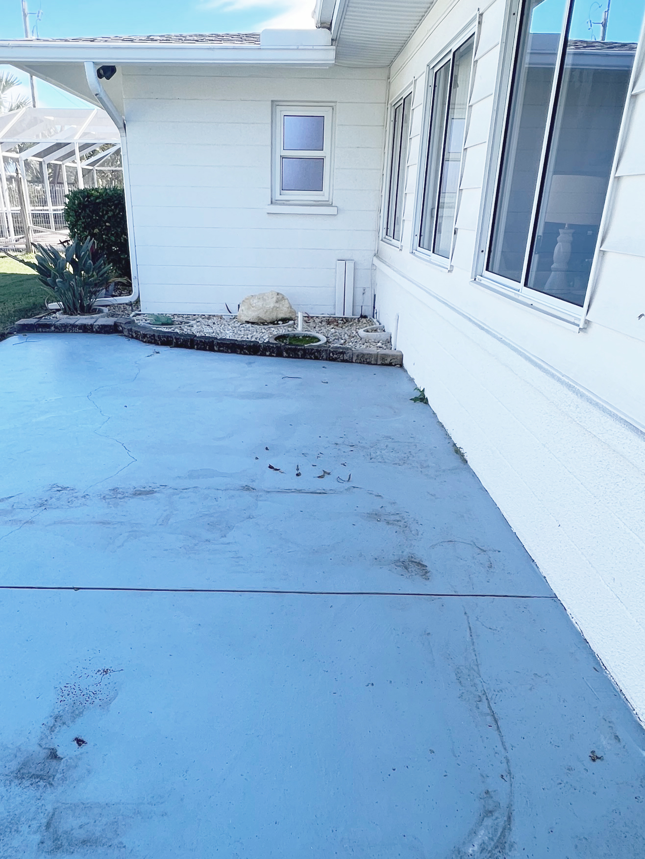 We bought 15 bags of white rock from Lowe’s and layered over the the sand for a fresher look. The last part of the makeover was to paint the patio. I power washed it, then used a cleaning solution to scrub and clean the surface.