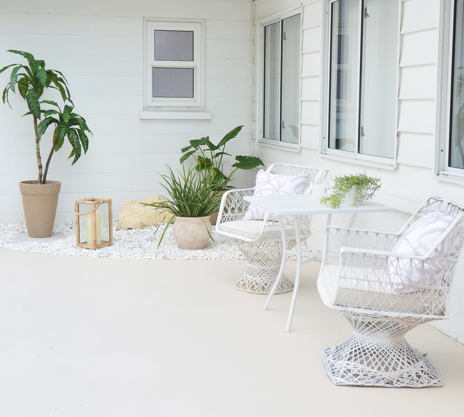 Here’s what the patio looked like when I started, you can see there wasn’t much that was exciting going on in that corner. I also didn’t like the shade of cornflower blue the patio had been painted before so I decided to change that too.