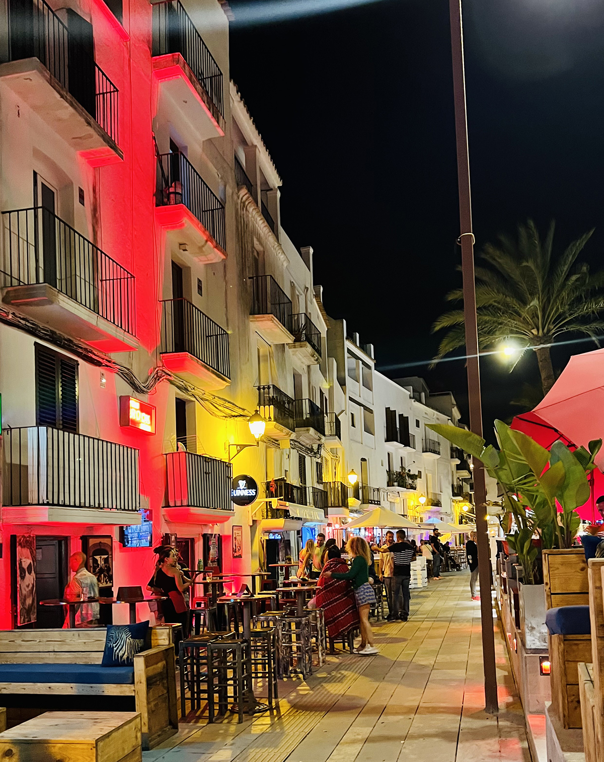 At nights the restaurants the line the marina are lit up with vivid colorful lights that change as you meander down alleys or streets with new music pulsing around every bend. You can feel the energy of the crowds of people both young and old mixing together in the cooler night air that’s a respite from the hotter days, and restaurants serve cocktails and tapas until the early morning hours! Ibiza is known for its nightlife and there is plenty of it!