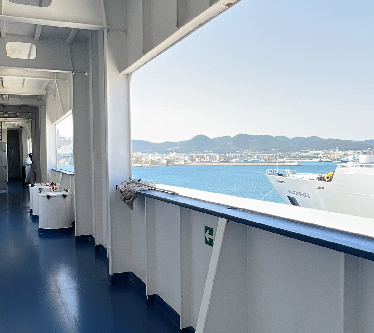Ibiza is one of the Balearic Islands and it’s only accessible by air or ferry. The ferry boats we traveled on were far larger than we expected, they’re actually cargo ships that also have passenger sleeping quarters for overnight journeys. We watched semitrucks load on and off these giant ferries and it was amazing to observe the efficiency of the transport of goods on such a large scale. We crossed the Mediterranean from Barcelona to Ibiza on a ten hour overnight journey, and awoke to crew members knocking on our doors reminding us to hurry because it was time to offload with the cargo trucks, cars, and fellow passengers.