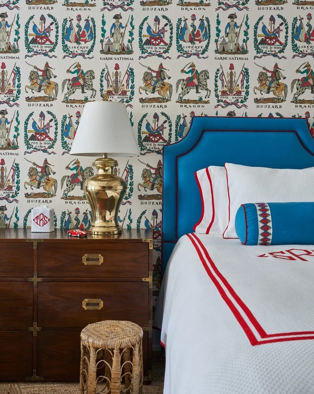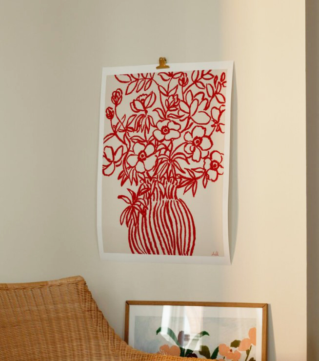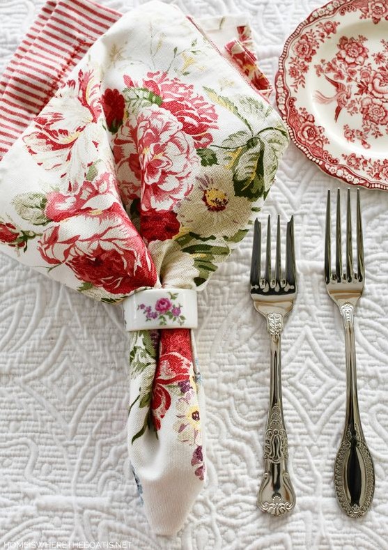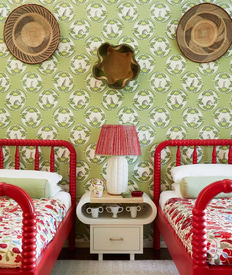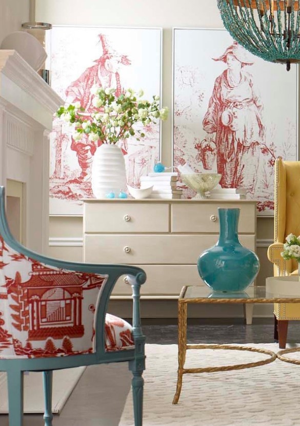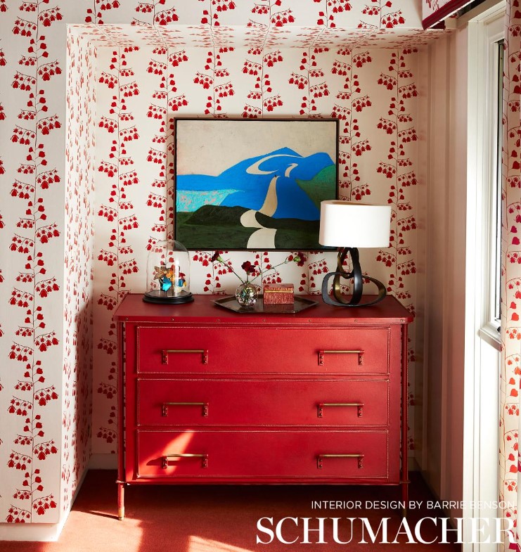 A touch of red is a welcome cheerful accent if layered lightly throughout a room, appearing in delicate ways through fabric patterns or artwork.