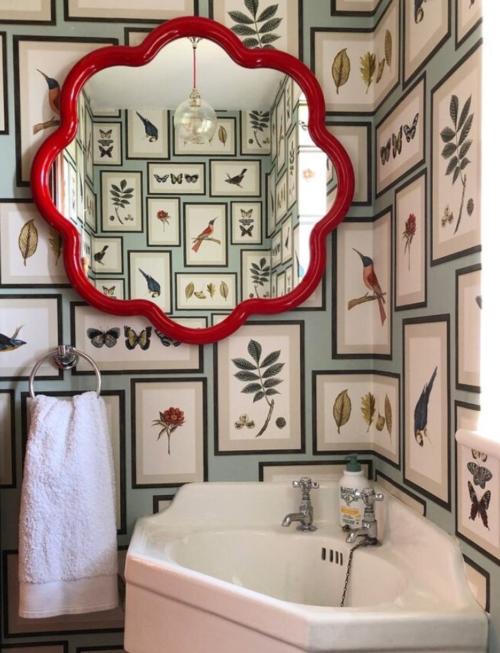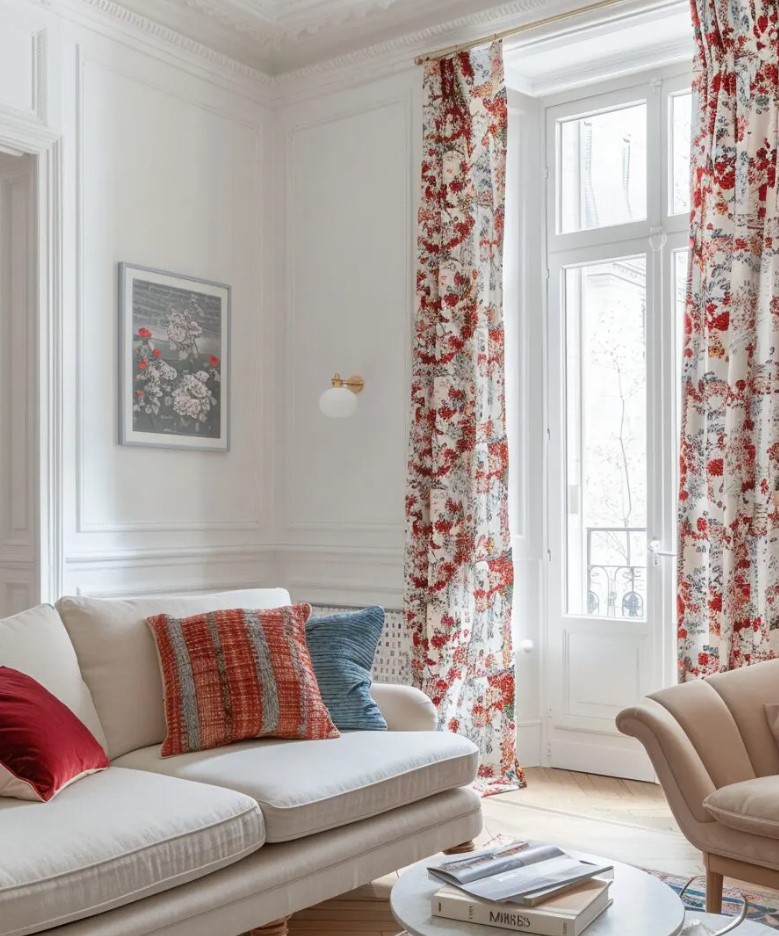 If you’re attracted to red and want to introduce this hue into your home consider accents to start, a botanical print curtain or a rug.