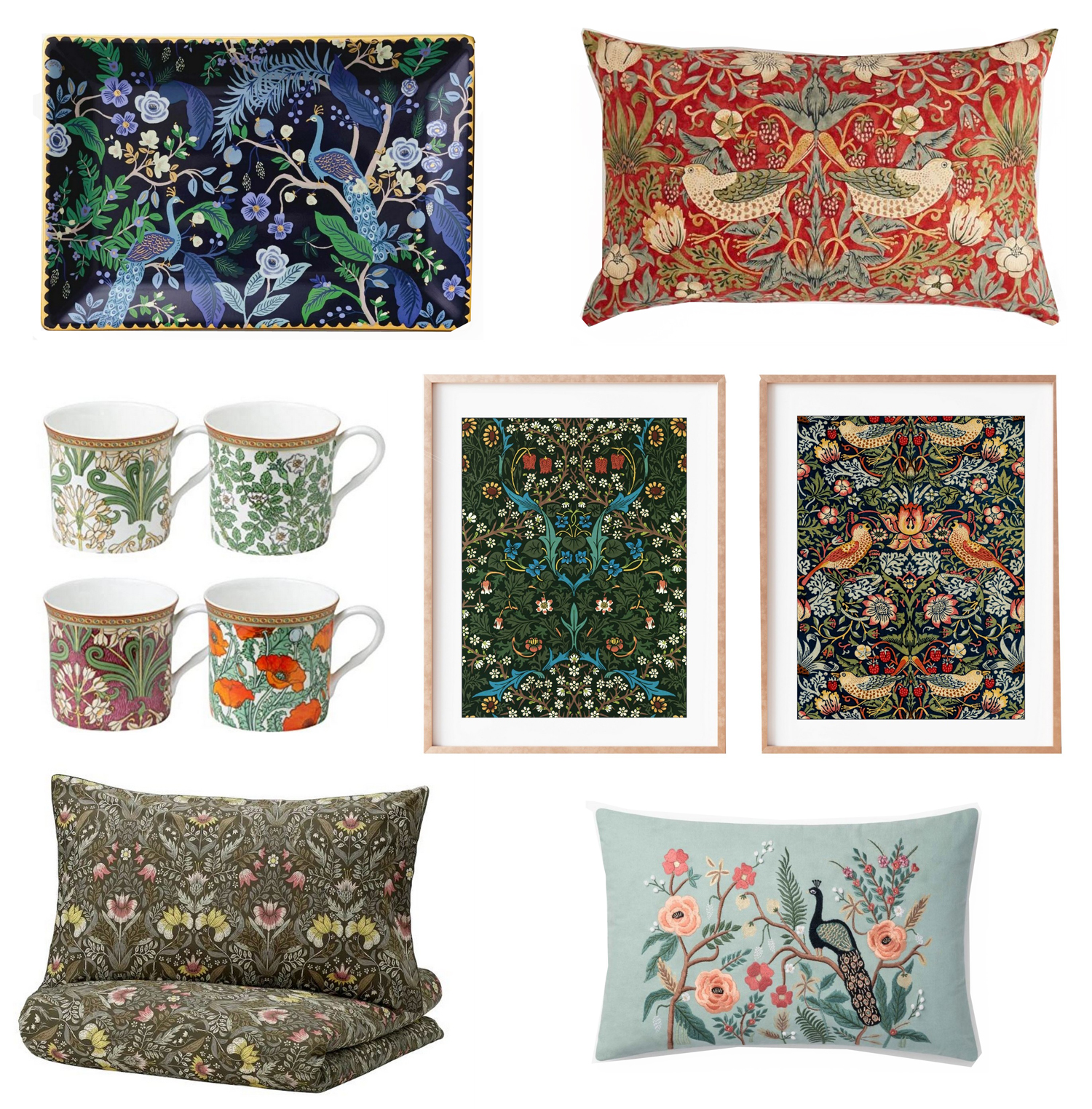 You can find may of the iconic William Morris patterns in the wallpaper collection at Morris & Co. Rifle Paper Co is known for their fresh takes on floral motifs similar in charm to old patterns pairing animals with botanicals. Below are a few decor favorites to add a touch of Victorian botanical patterns to your space.