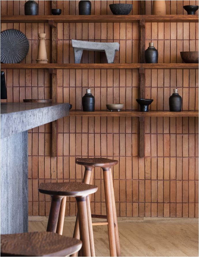 1. Install earth tone tiles floor to ceiling behind rustic open shelves.