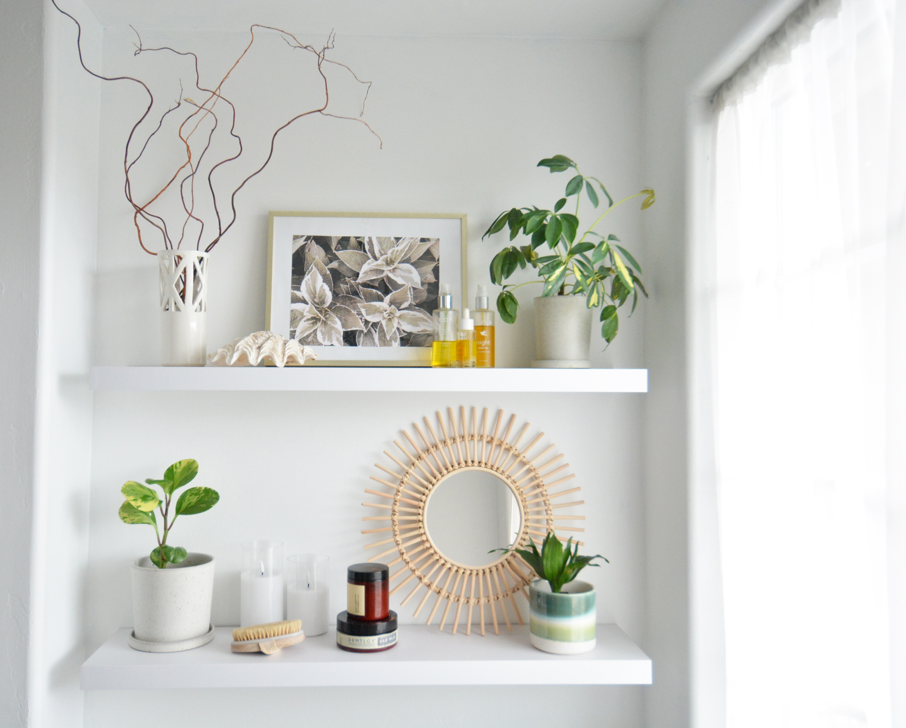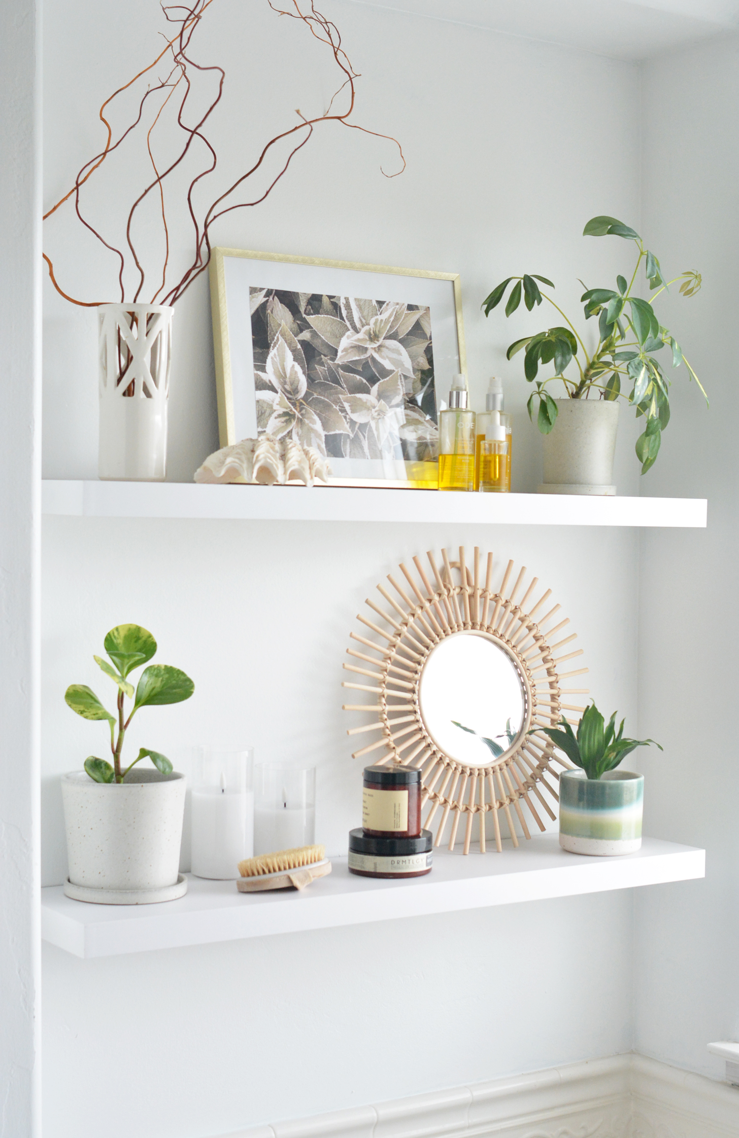 Two floating shelves and a few decorative objects completely transformed this 3×5’ niche. Looking forward to my bath tonight!