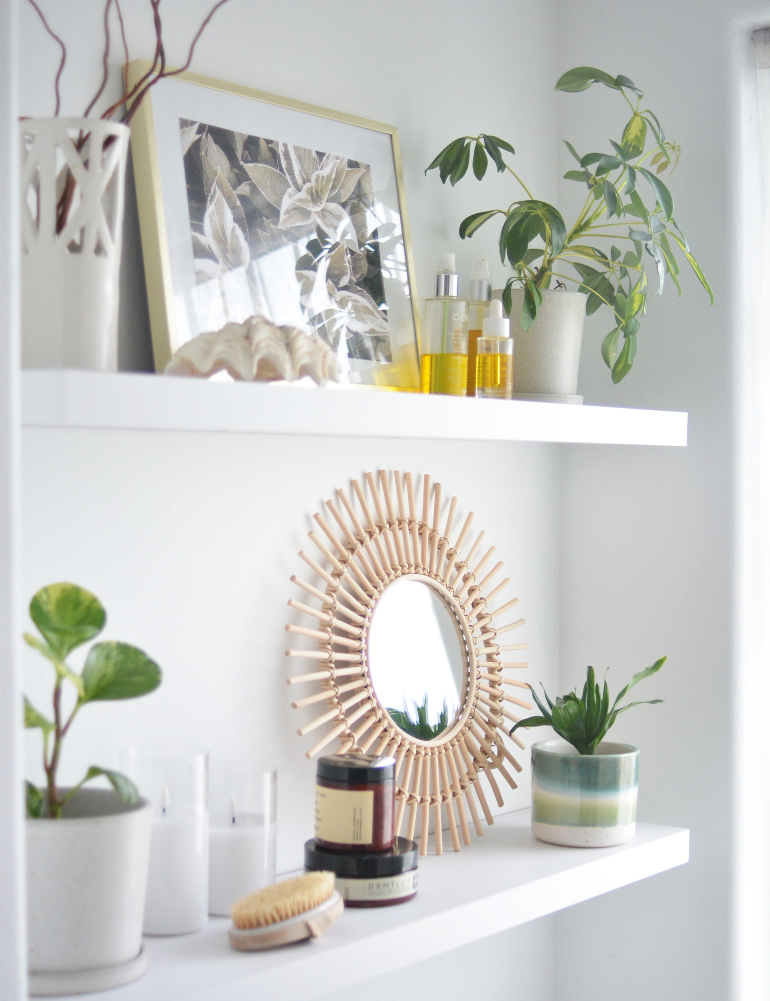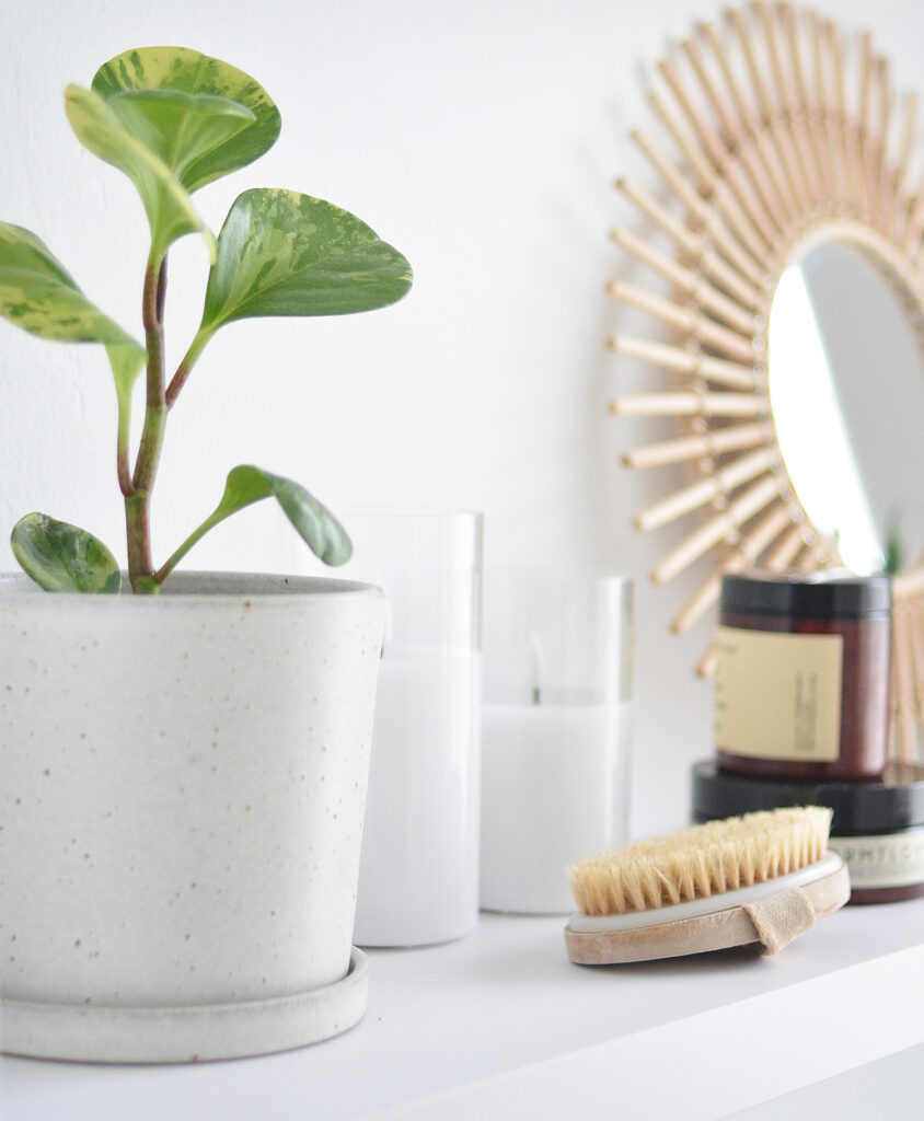 To add plants and organic texture, I ordered a speckled planter with saucer and also a smaller size with a small rattan mirror from H&M.