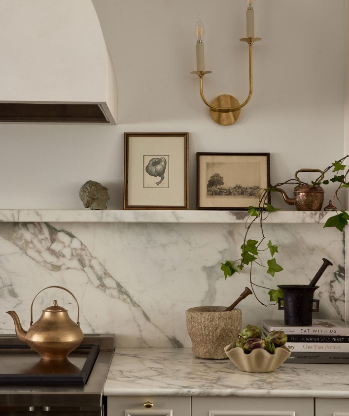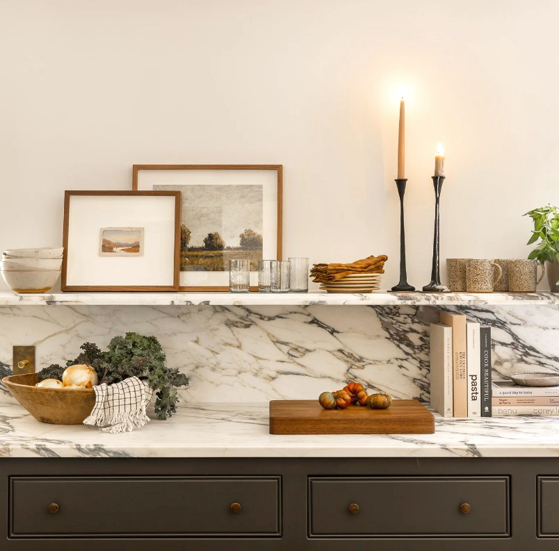 Have you noticed lately in every styled kitchen a little piece of art pops up somewhere? Art has been displayed in European kitchens forever, and it’s a layering technique we’ve seen in domestic kitchens for a few years. Framed art adds warmth and character to a space so naturally designers and stylists use art as alluring decor in kitchens.