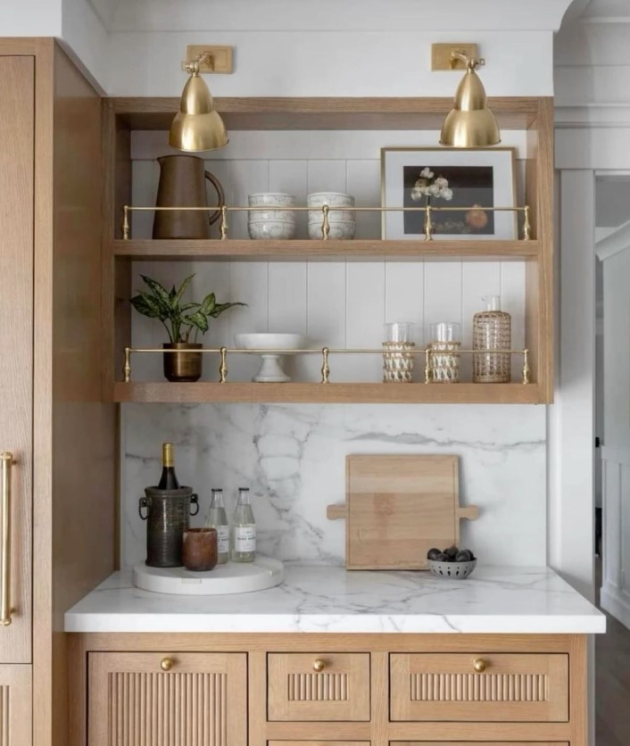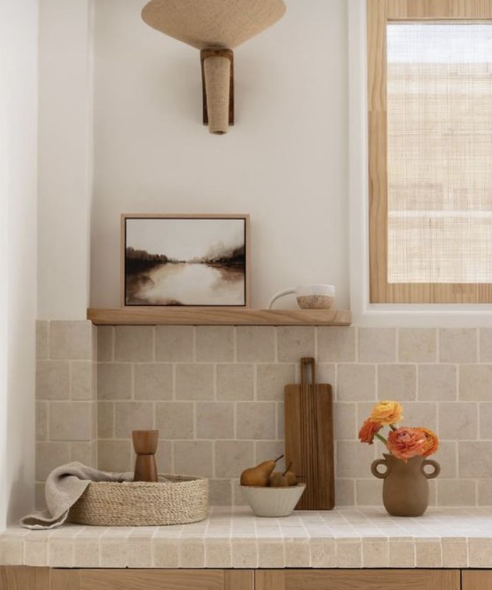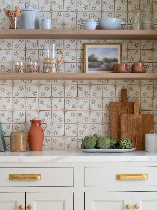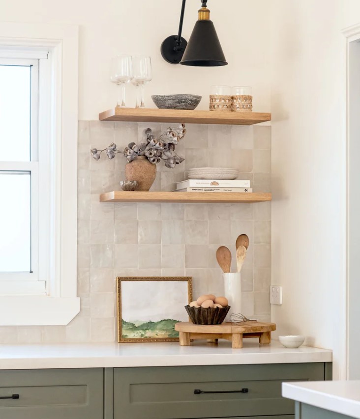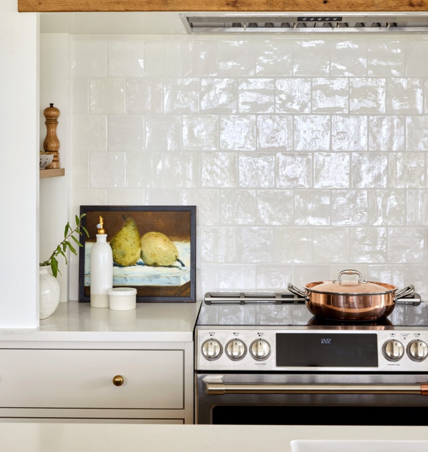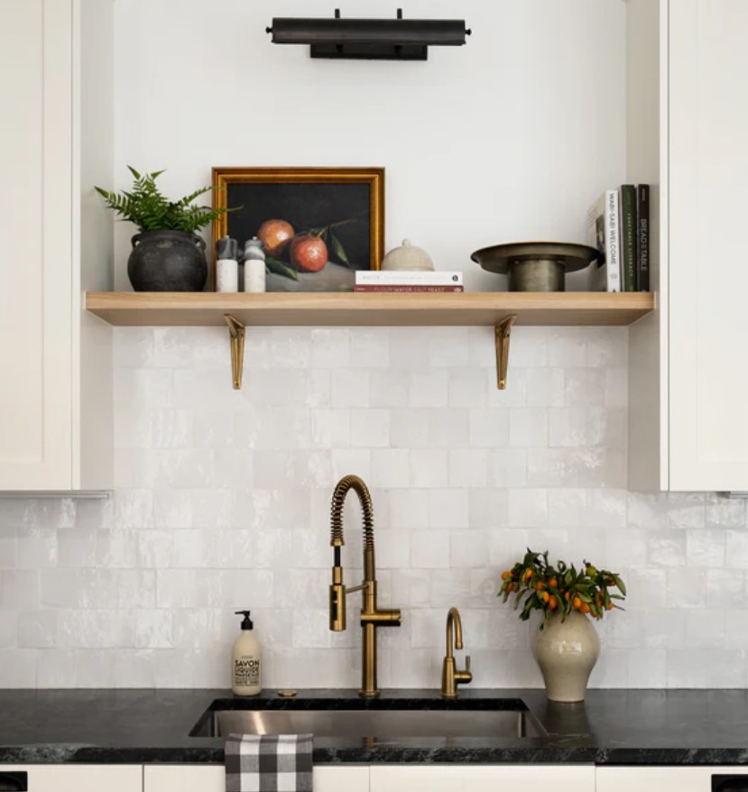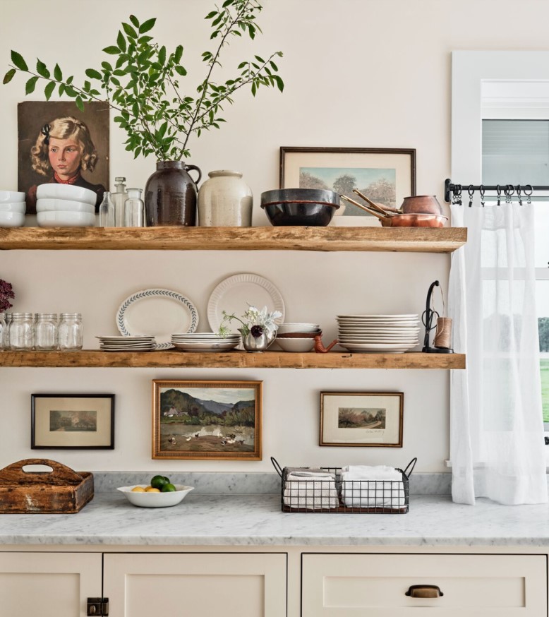 Ever since open shelves became a timeless addition to a kitchen, people look to fill the vertical area between or above shelves with pleasing elements, this is where one or two pieces of framed art helps to draw the eye to the shelf scene. In addition to wood cutting boards, art can be used on the countertop to disguise electric plugs on the walls so the backsplash feels uninterrupted.