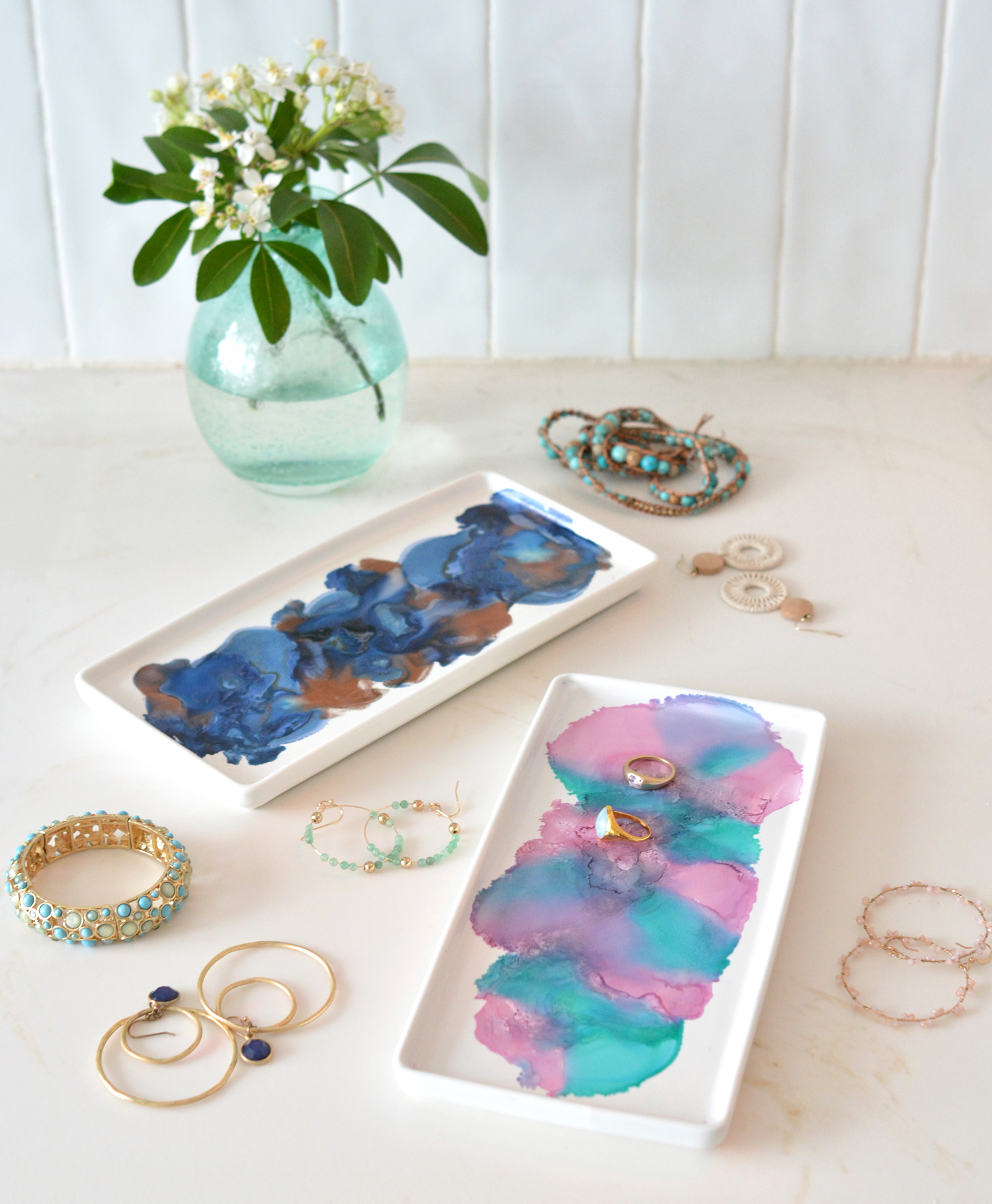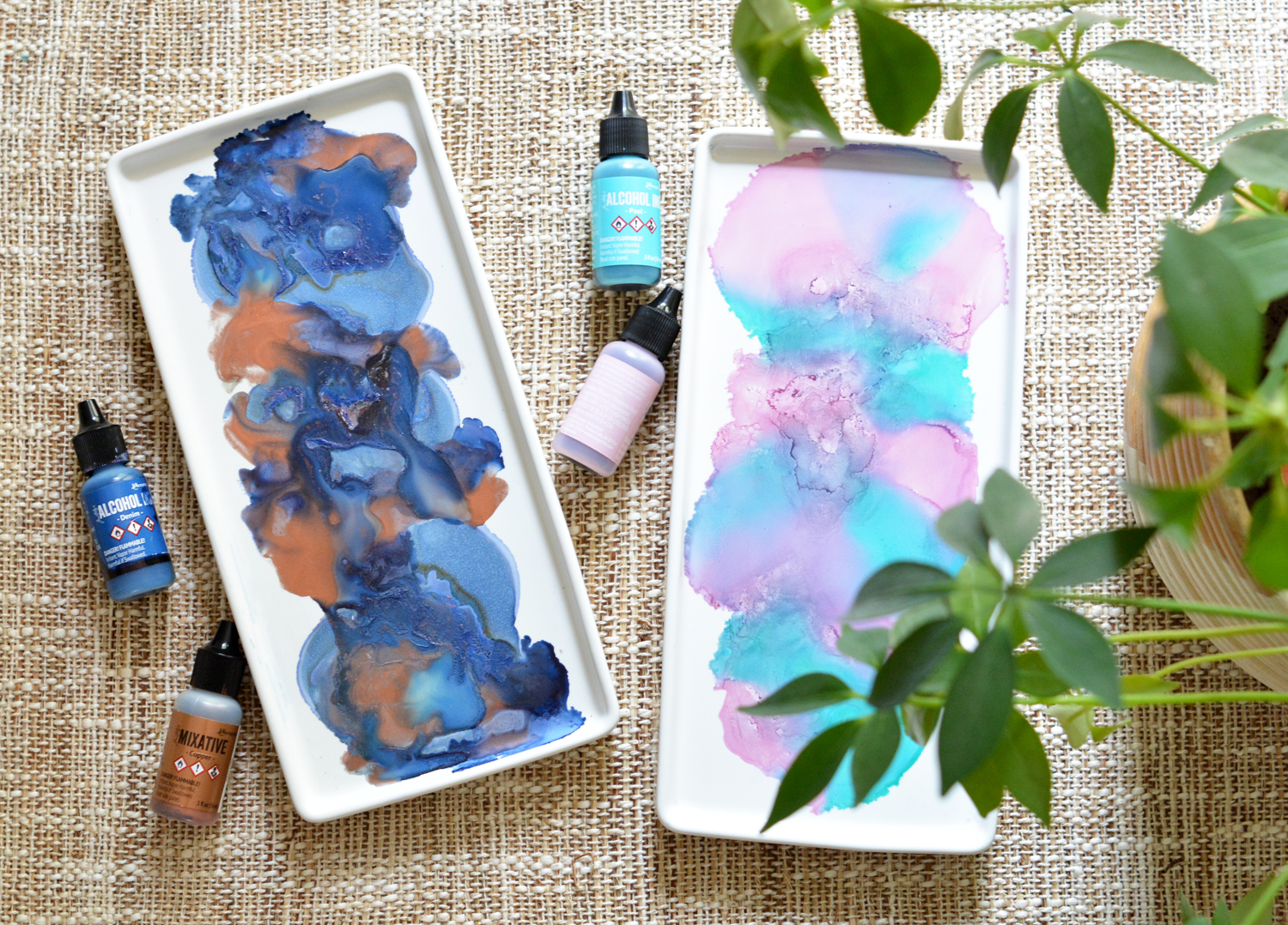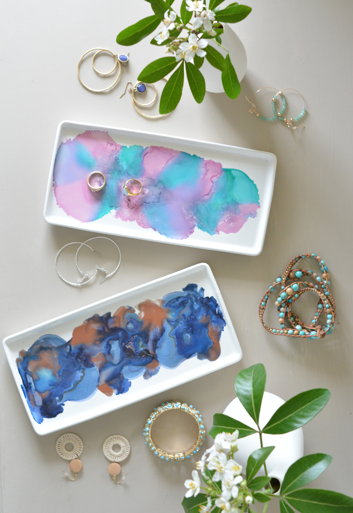 I like to dabble in different art mediums and alcohol ink is my latest experiment. I’m delighted to share that I created these lovely trays for holding small items. The size I chose works well with jewelry but you could also use these to corral beauty products.
