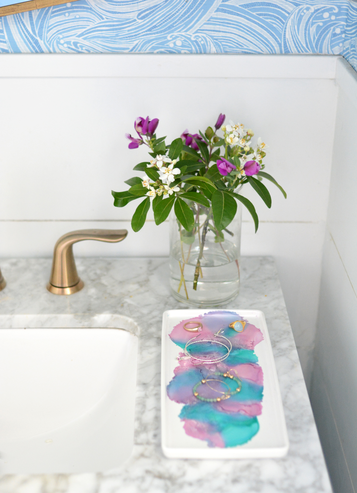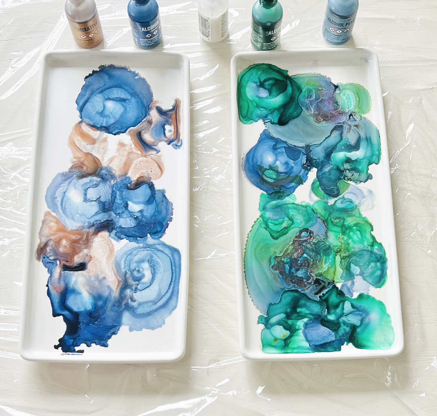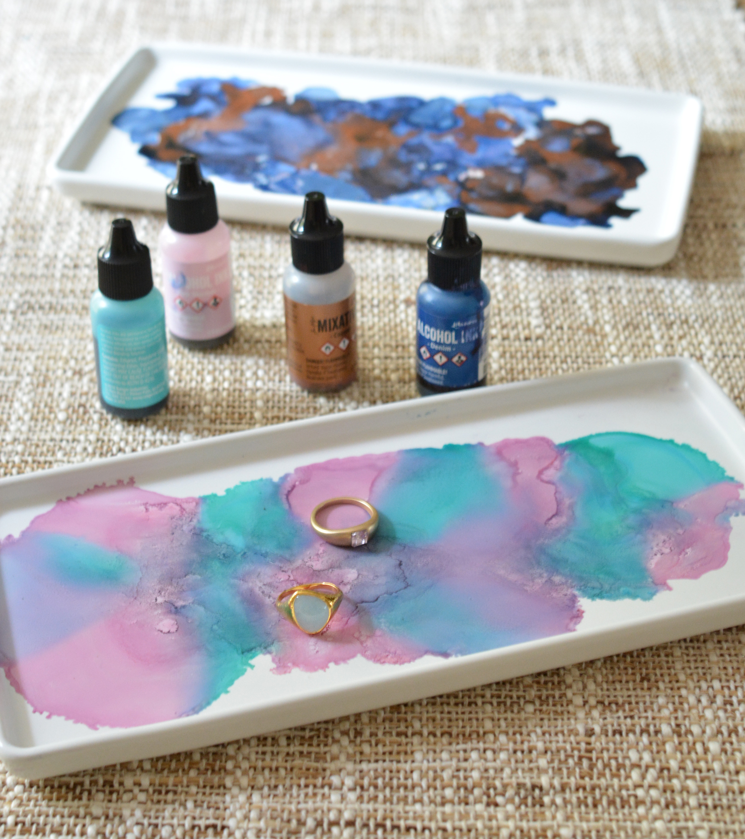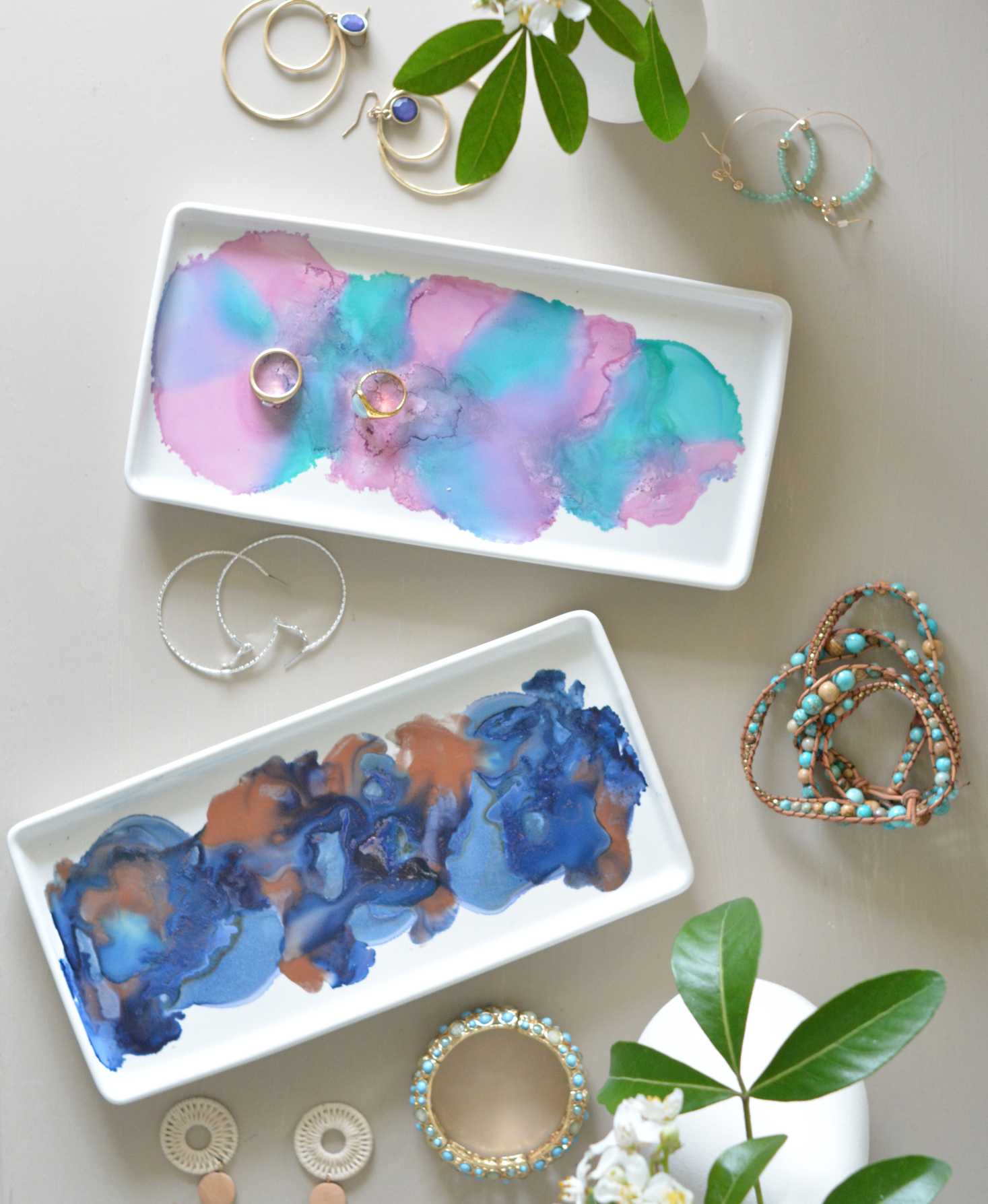 I like to dabble in different art mediums and alcohol ink is my latest experiment. I’m delighted to share that I created these lovely trays for holding small items. The size I chose works well with jewelry but you could also use these to corral beauty products.