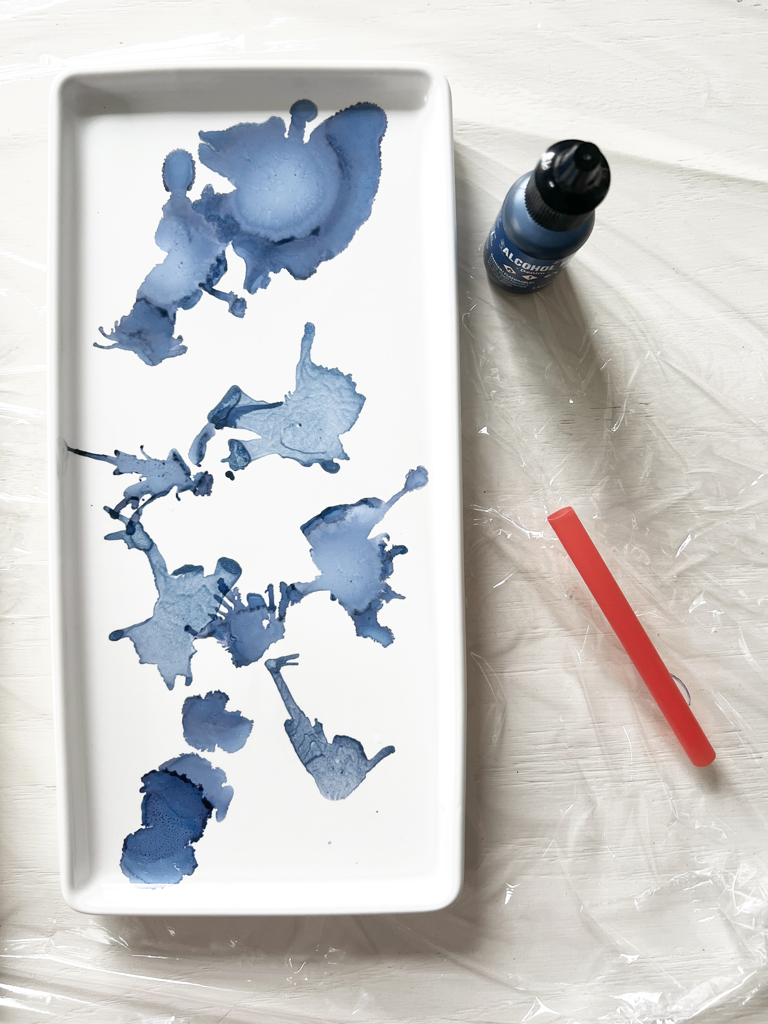 The supplies for this project are simple, I used these white trays and bought a few alcohol inks both online and at Michaels (that store has a great selection). You’ll also need a straw, some rubbing alcohol, paper towels, and clear coat protectant to seal the trays at the end.