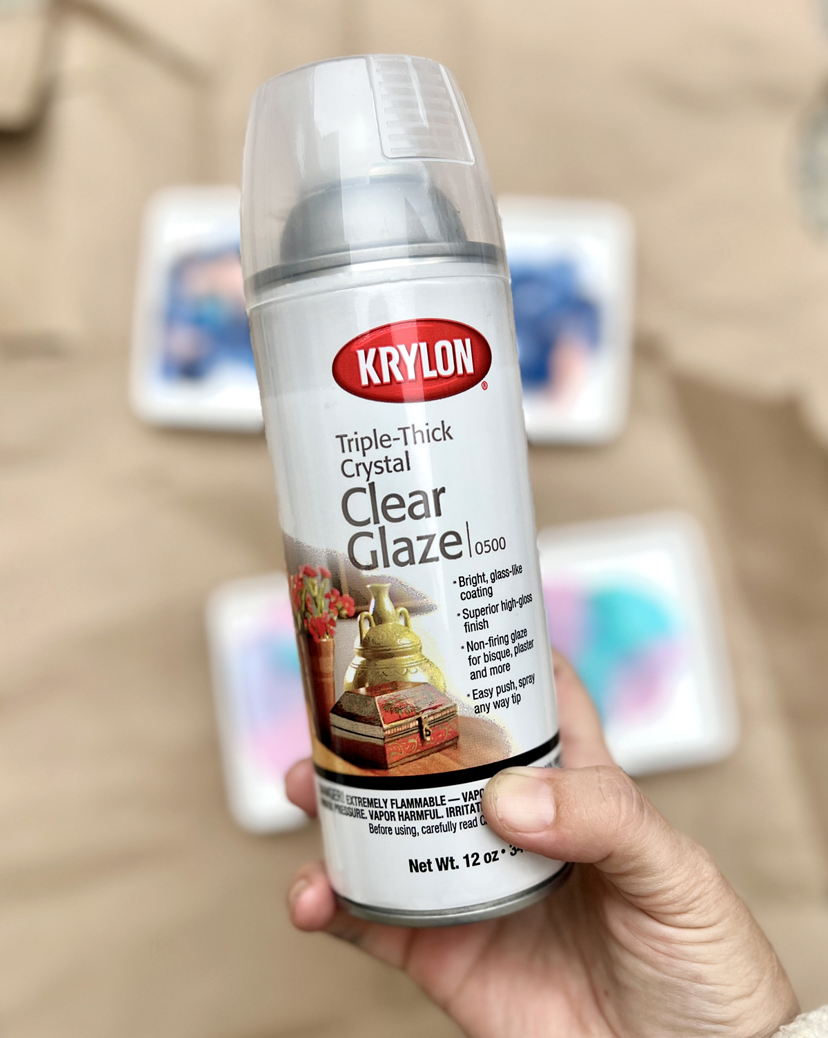 Once you’re satisfied with a design, seal the surface of the trays with two coats of spray on clear coat, allowing to dry fully between coats. Once the surface is protected, the design will stay in place and won’t wipe away.