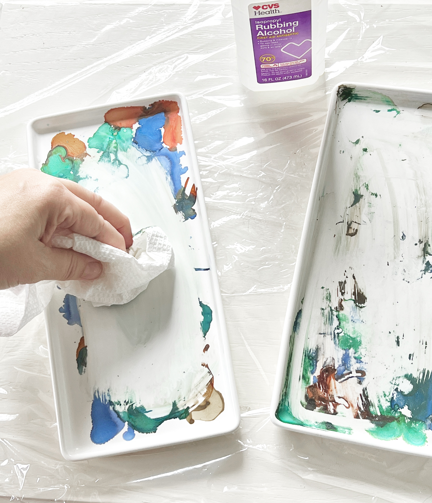 With paper and alcohol ink, you have to accept where the ink goes but with ceramic or glass applications you can wipe away the ink if dissatisfied and start over. I did this several times. Rubbing alcohol and a paper towel are all you need to start over with a new design.
