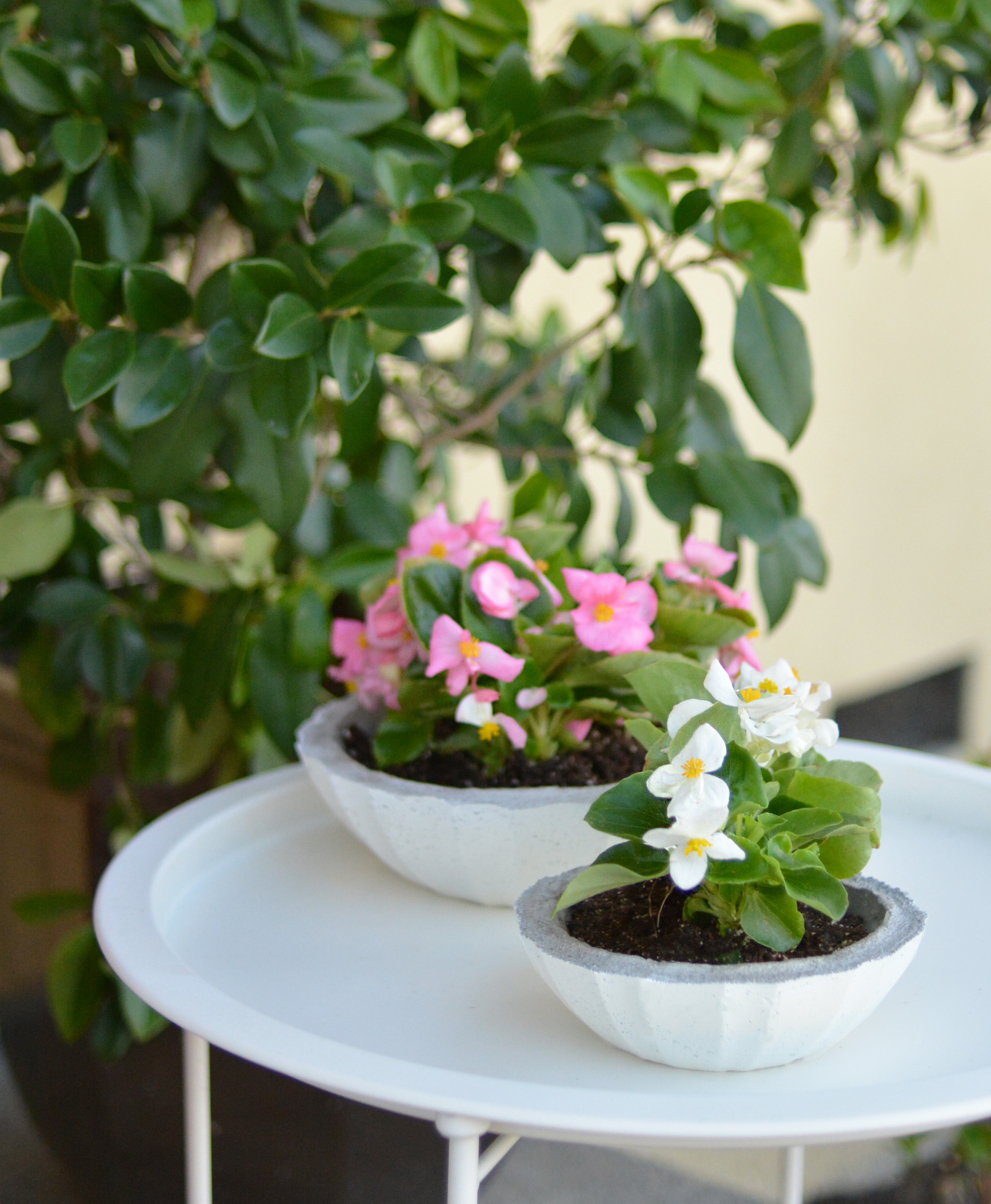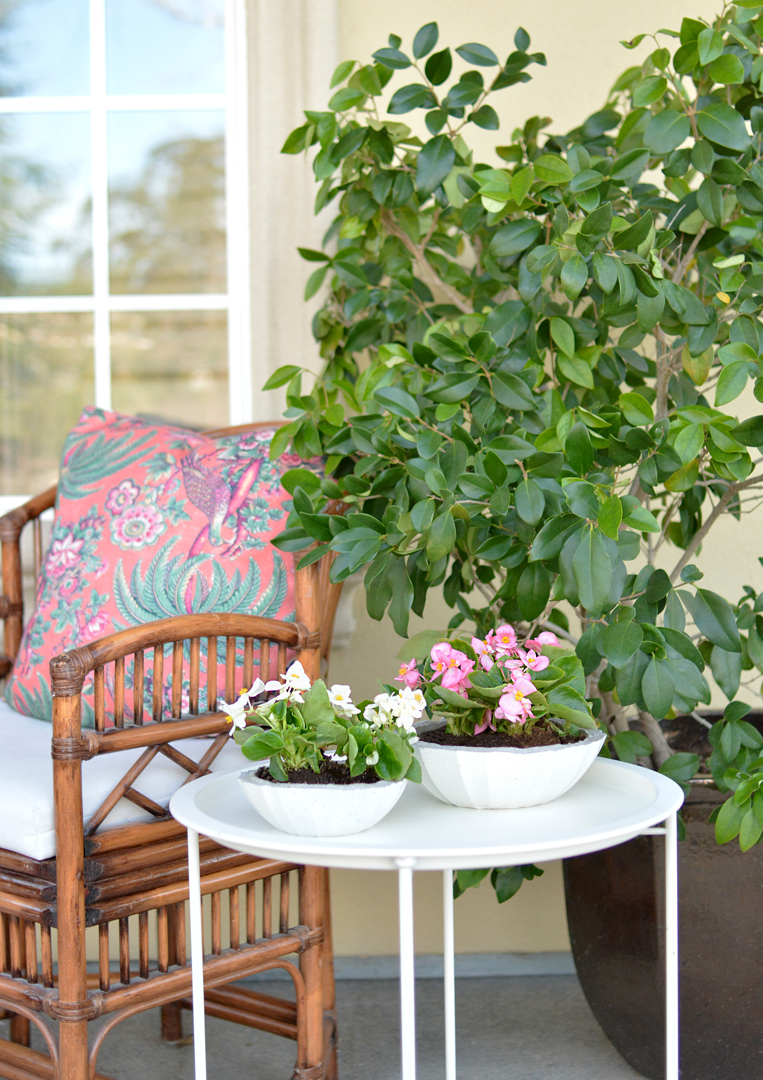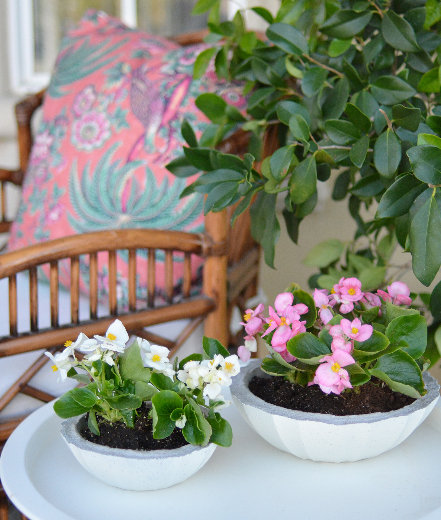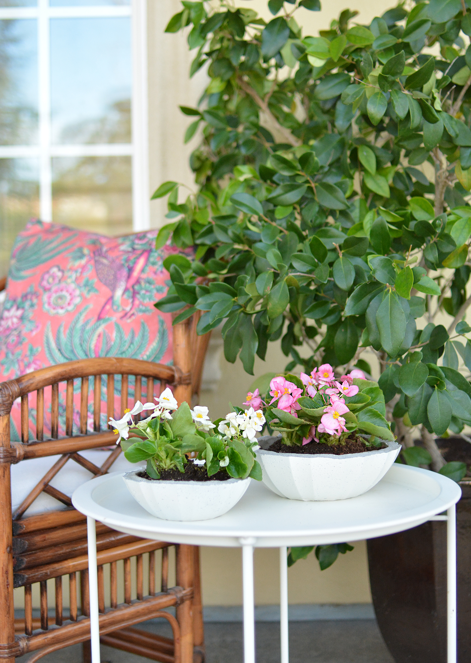 These planters you can create in one afternoon, they’re simple to make with small amounts of cement and make unique tabletop planters for flowers or succulents. Spring has arrived here in California so this was the perfect little project to add some seasonal annuals to the front porch.