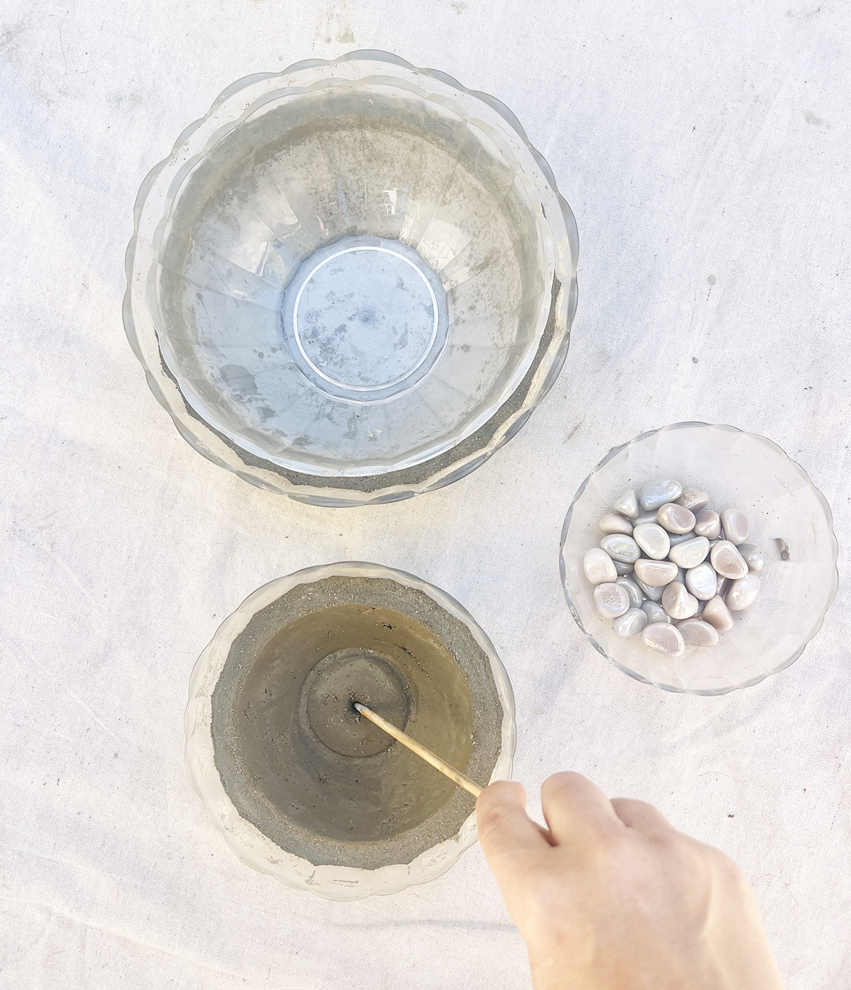 Step Two: Allow the cement to dry to the point the planter shape is formed but not completely solid. (In my case, I removed the inside bowl after 45 minutes once the cement had set, then used a chopstick to create a small hole in the bottom while the cement was still soft.)