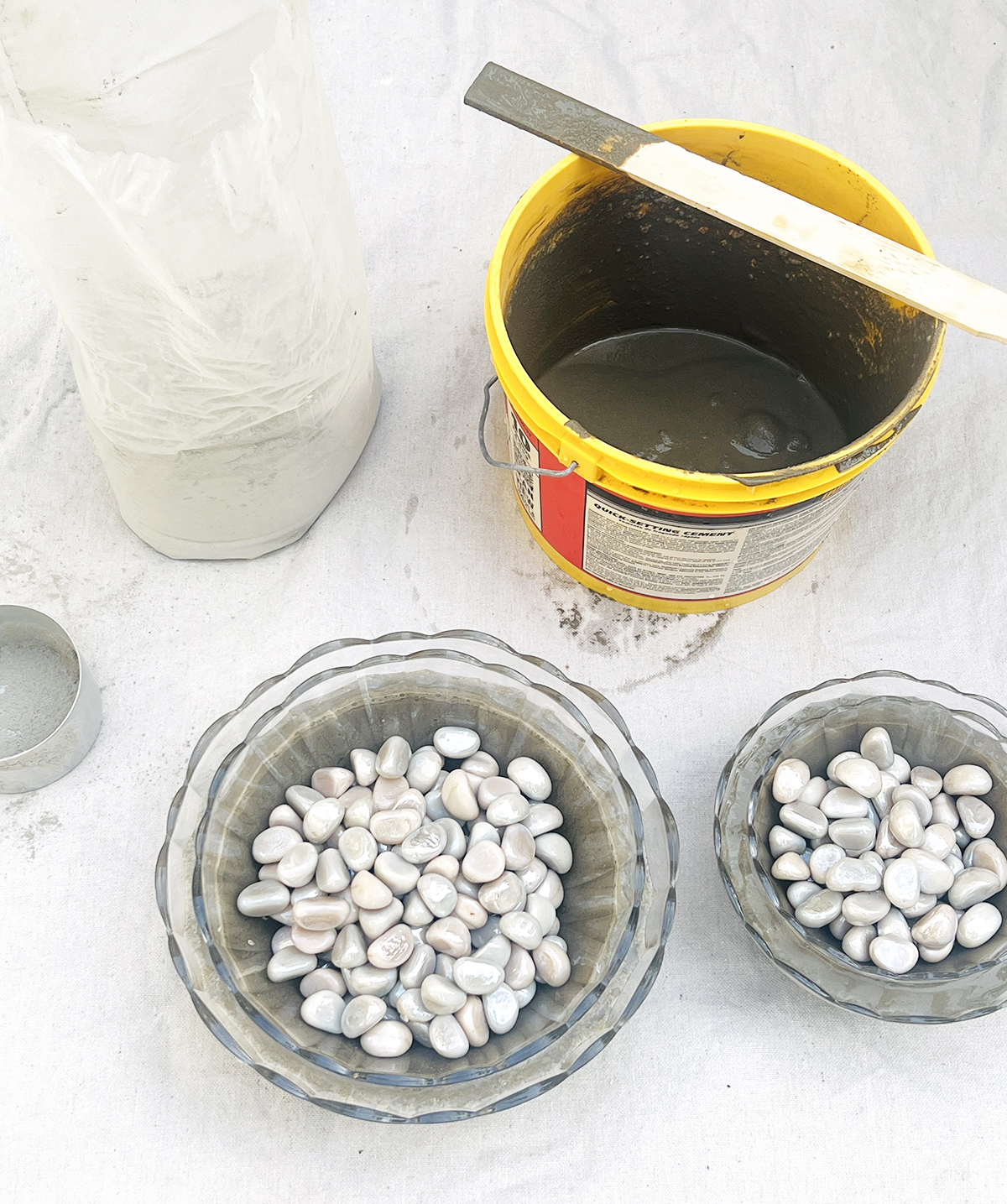 Step One: Prep the inside and outside of the bowls by applying a light coat of oil with a paper towel to help the cement release. Mix the cement as directed and pour into the bowls so they are filled halfway. Use the next smaller size bowl to nest inside the larger bowl and gently push it down to displace the cement so it forms the planter walls. Use the pebbles or rocks as weights to hold the smaller acrylic bowl down as it sits inside the larger bowl.