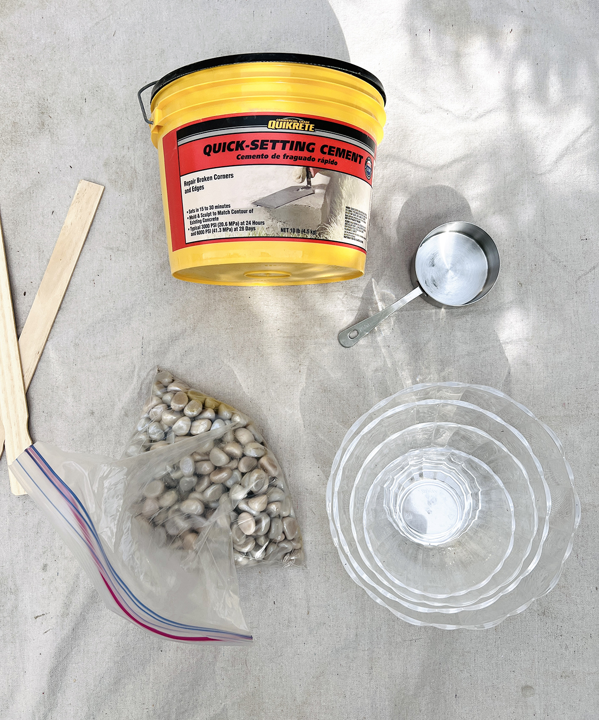 Supplies to recreate these planter bowls: set of four acrylic bowls; quick setting cement; tarp; bucket & stir stick; vegetable or olive oil; measuring cup; pebbles or rocks for weights; spray paint (optional); soil & flowers.