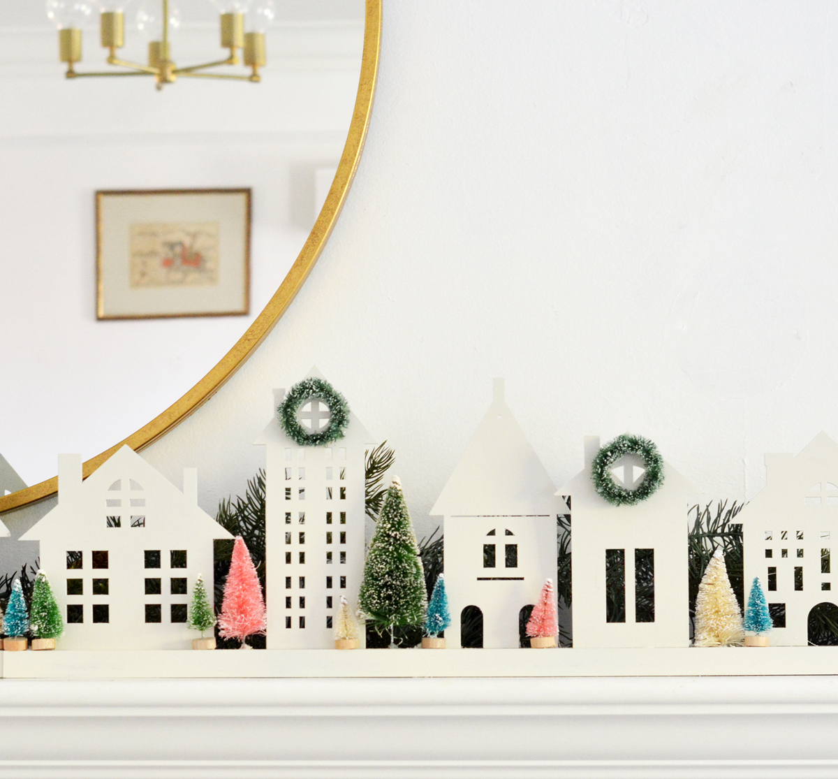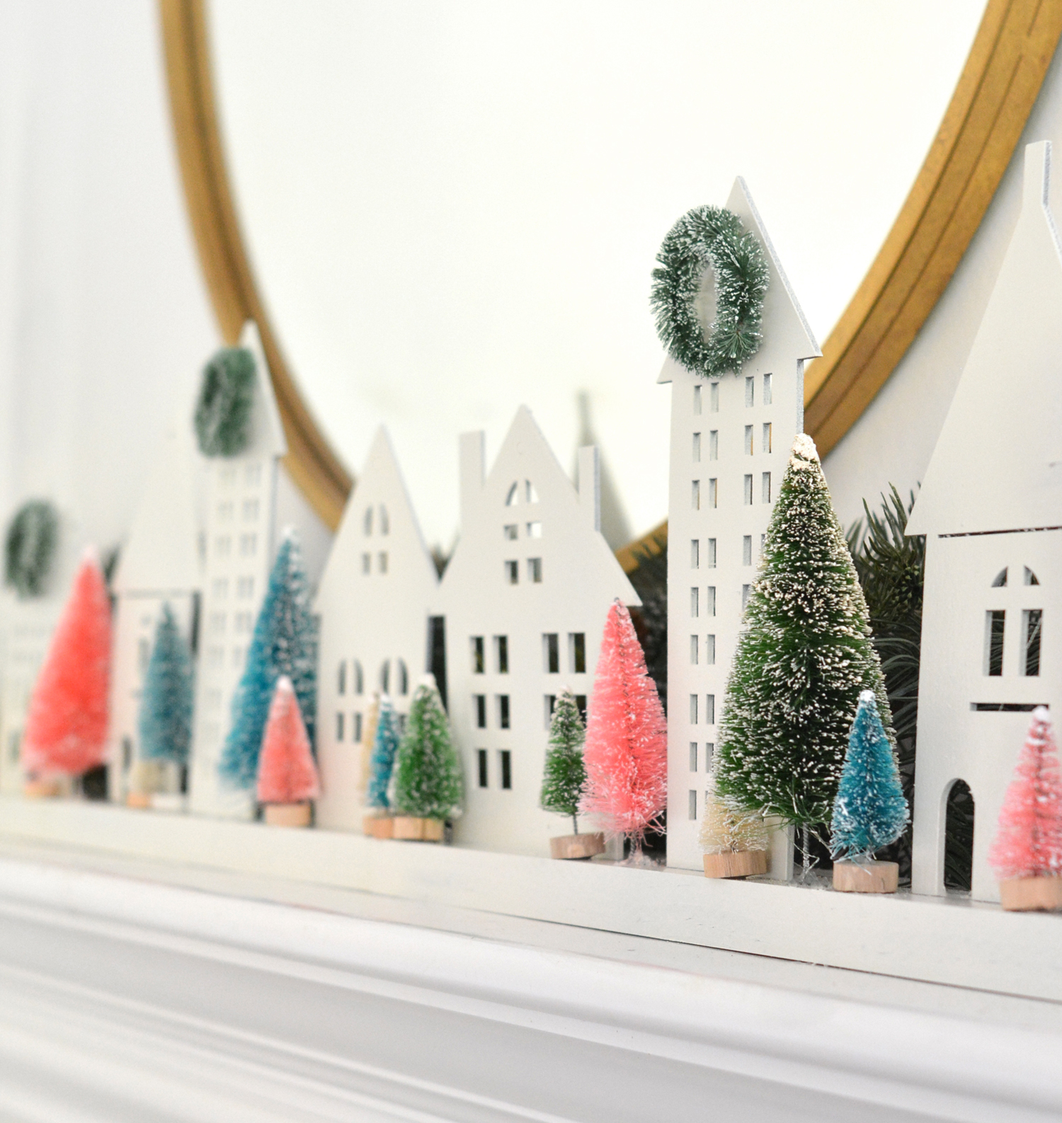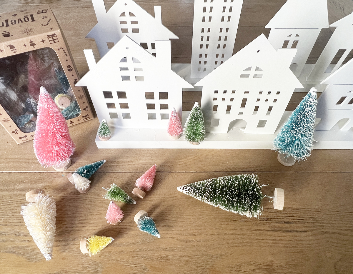 It’s made with wood houses, bristle brush trees, and a few additional supplies listed below. You can use any color trees you find to coordinate with your home’s seasonal color palette. I chose cheerful pink, turquoise, and green trees for my little village.