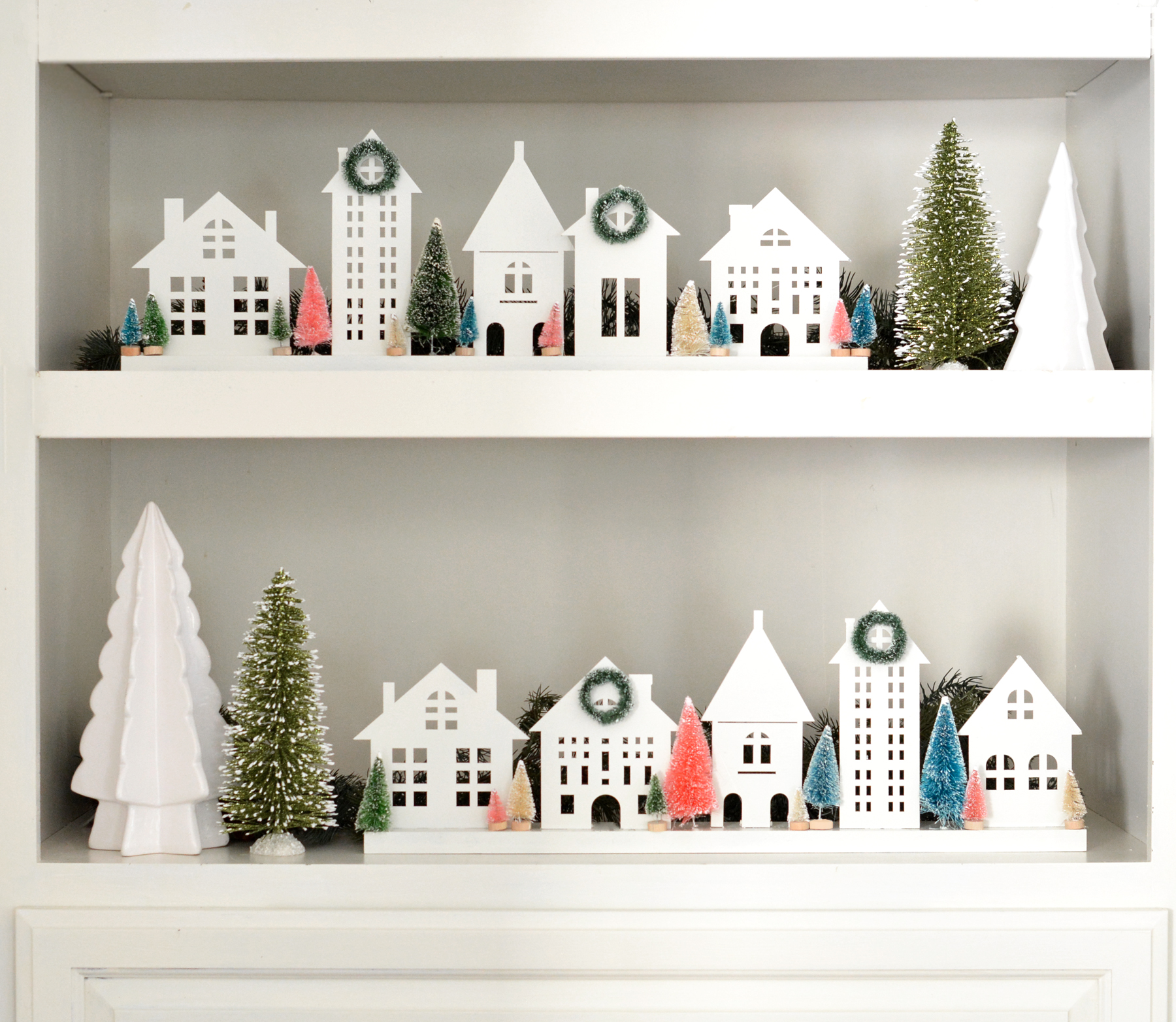 In the Halloween village post it lists all the supplies, but I’ll list them here again with the holiday decorative items needed to recreate these little villages that you can use to style your home for years to come.