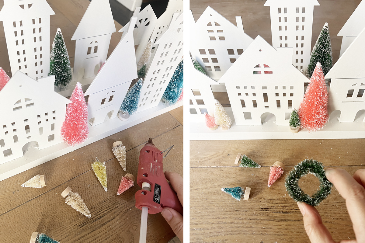 Step Three: If you want to nestle the trees inside the wood base, unscrew them from their circle base. Drill ¼ inch hole for each tree, apply hot glue to the holes so trees stand straight. Alternatively you can simply glue the trees with their circles attached to the wood base, I did both. Attach mini wreath to every other wood house.