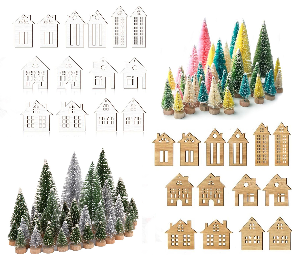 Christmas village supplies needed: set of wood houses either white or natural wood in size large; mini bristle brush trees; mini wreaths (these or these), a few sets of wood chopsticks; hot glue & glue gun; drill and drill bits (optional); LED tea lights (optional), white spray paint.