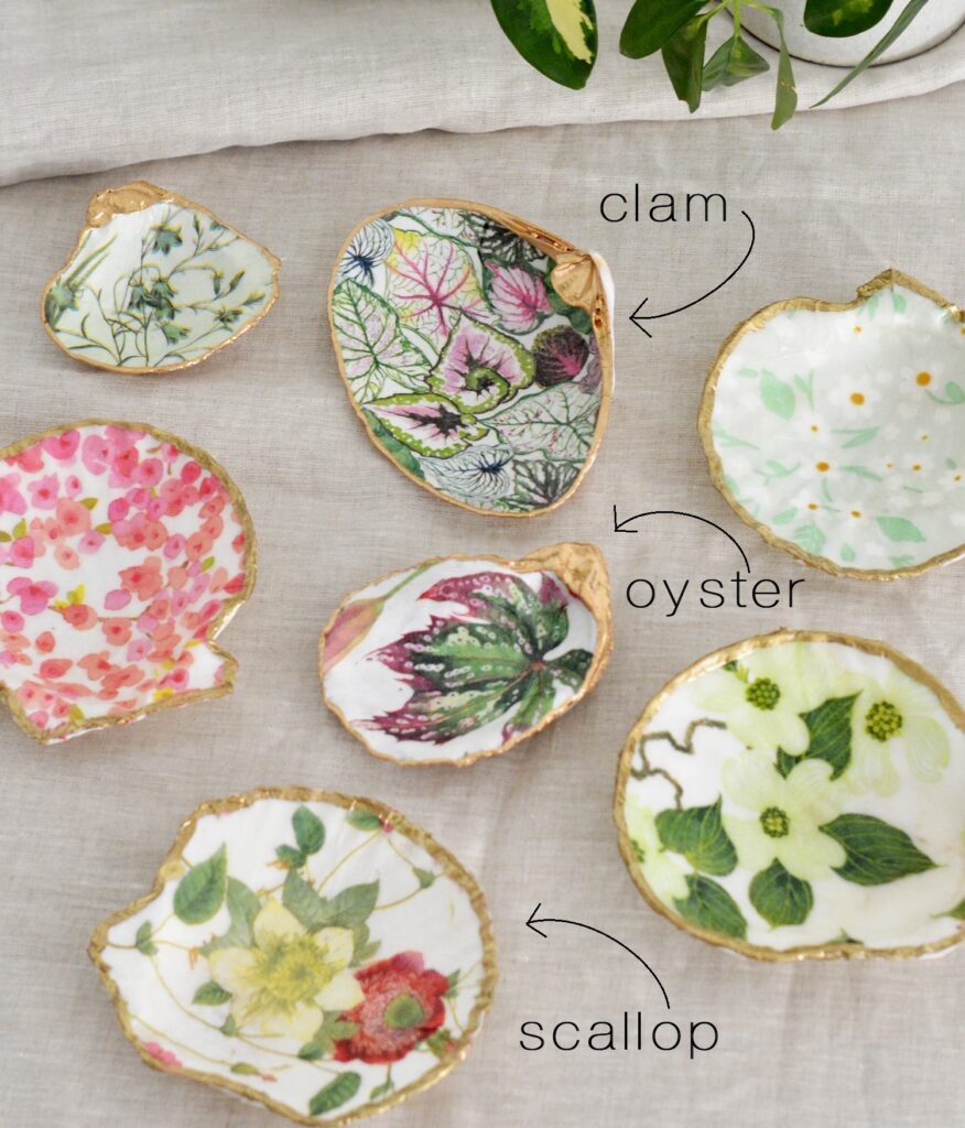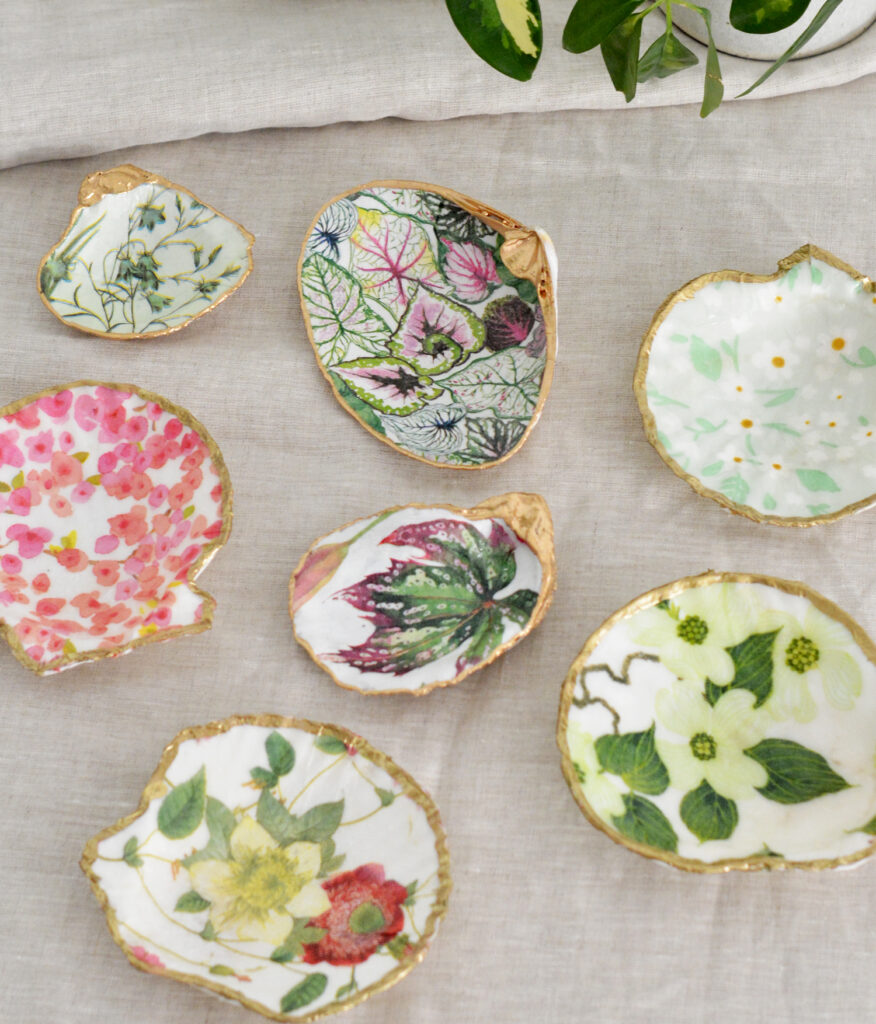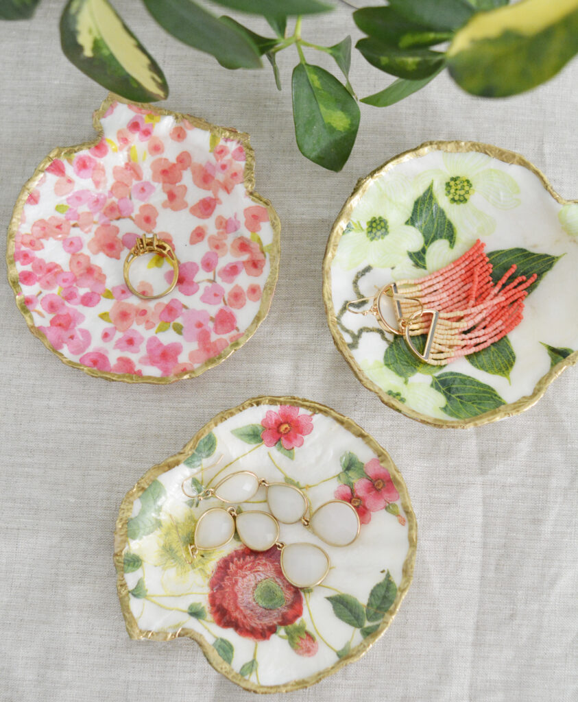 A few months ago I ordered decoupage shell trinket trays from a wholesale vendor and ended up selling a dozen very quickly in my local shop. People are drawn to them for their organic shape with the gilded edges and pretty patterns inside.