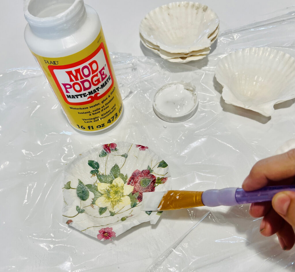 Step Four: Add a thin layer of decoupage medium to the top of the shell on top of the patterned napkin with a medium size craft paintbrush. Allow the layer to dry for two hours, then add second thin layer of decoupage medium and allow to dry an additional two hours.