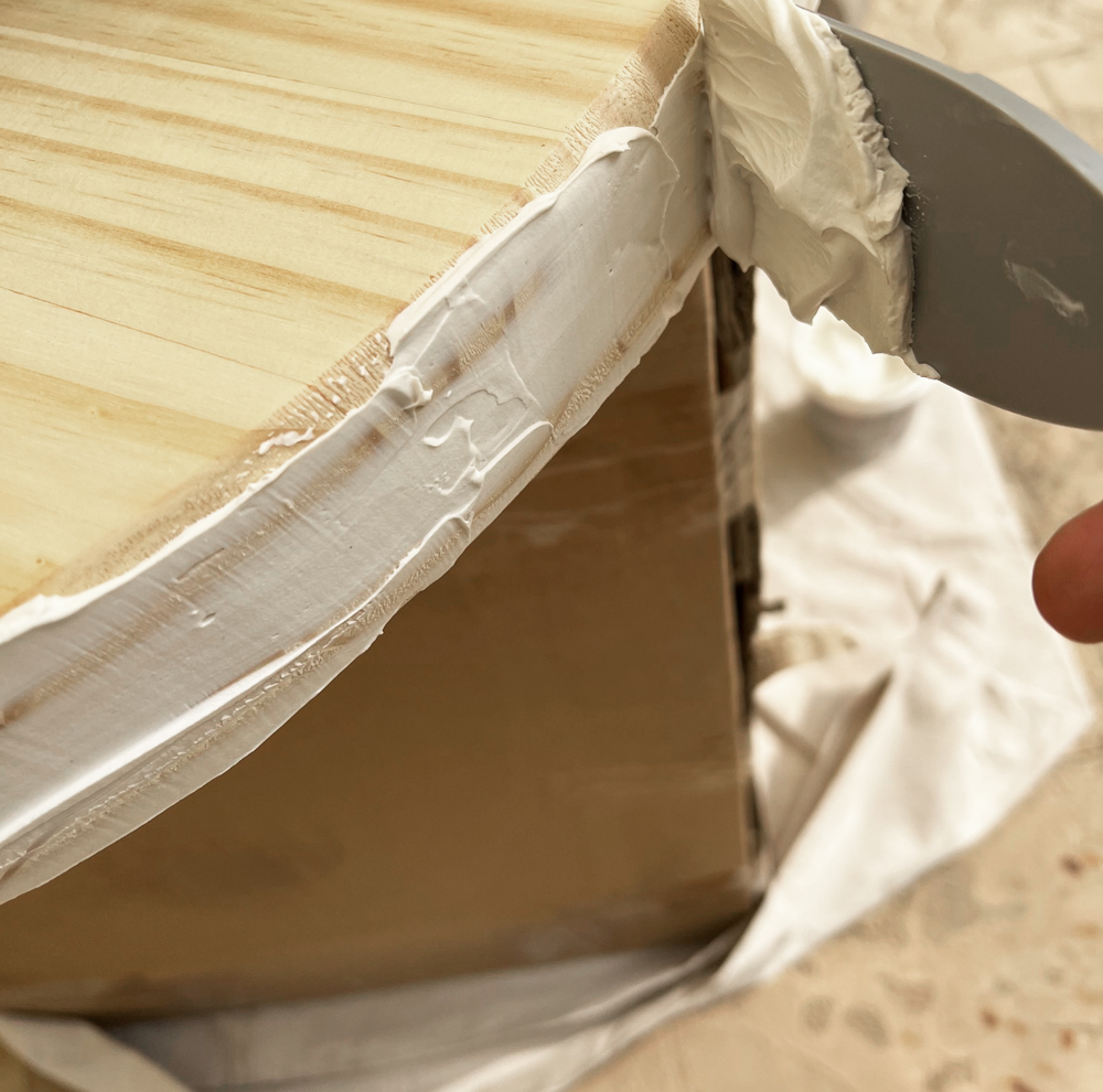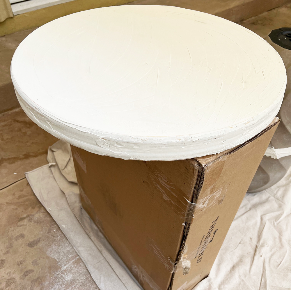To make the top, first, glue the two 24” tops with wood glue and set heavy books on top so they stay put and bond together. Allow to dry about 2 hours. Coat the wood circle sides and top with two thin layers of joint compound. It’s helpful to do this on a prop of some kind. Sand between coats and after second coat dries sand again to create a mostly smooth surface. I left mine imperfectly smooth on top because I liked the texture.