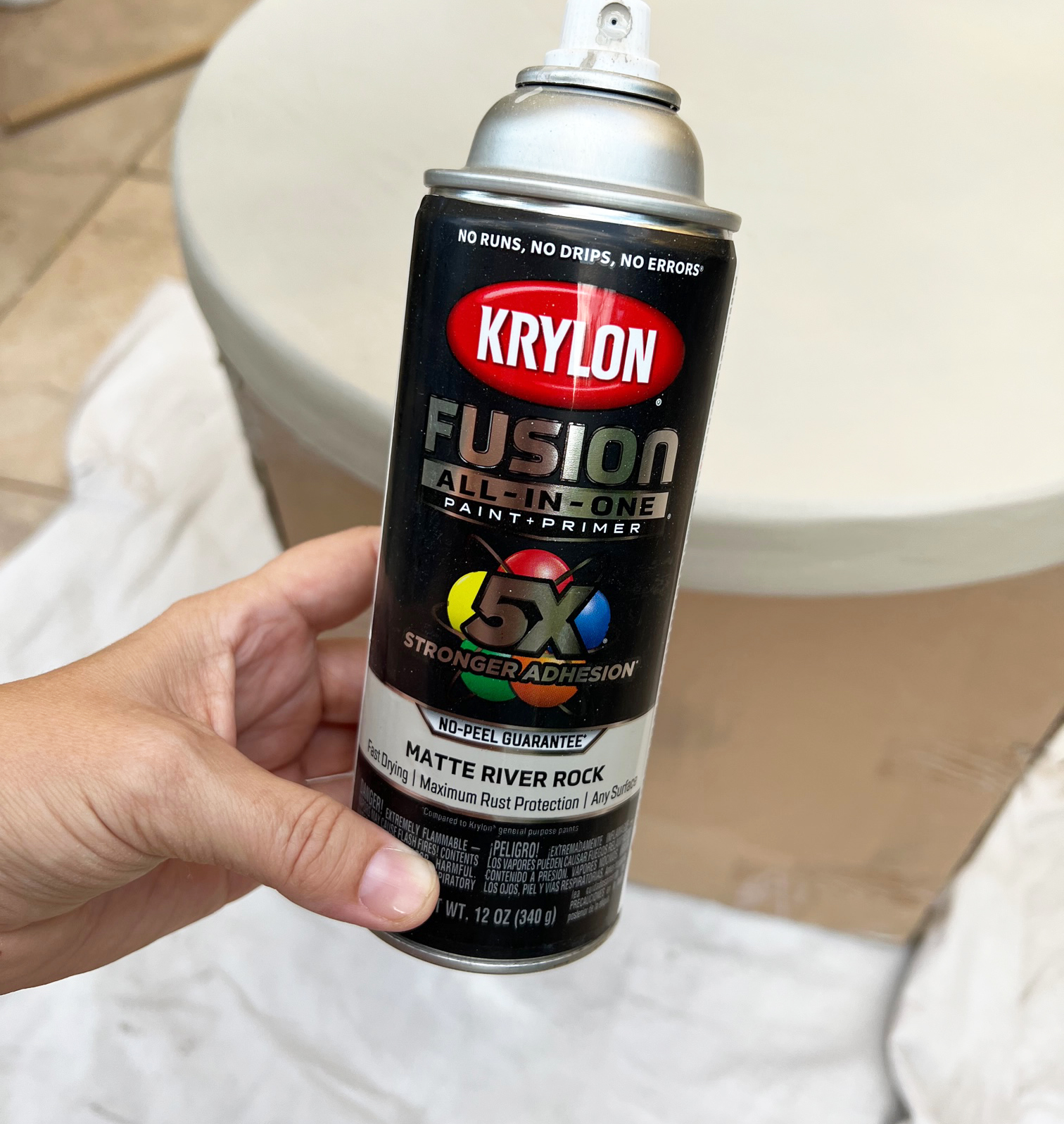 Once the joint compound is sanded and smooth, coat the top and pedestal with spray paint. I chose River Rock by Valspar to mimic a stone hue.