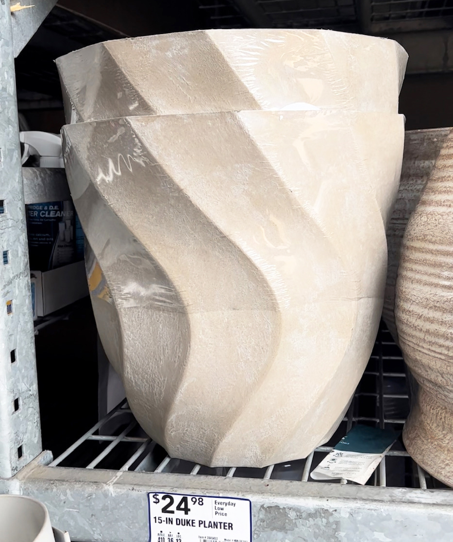 I was in the garden department and spotted some curved resin planters and thought if I put two together they’d form a nice base for an accent table. It took plastic bonder and joint compound to unite them, and here is the final result: