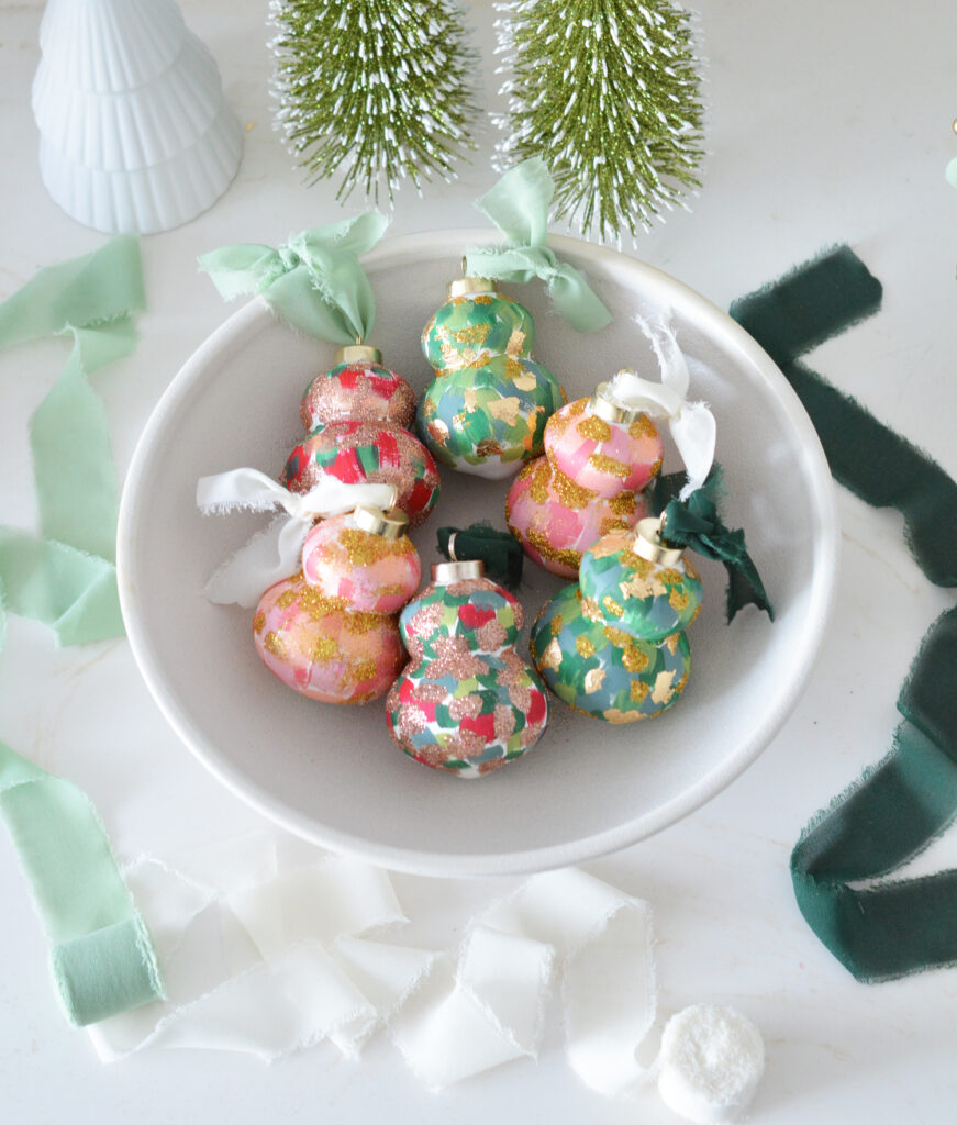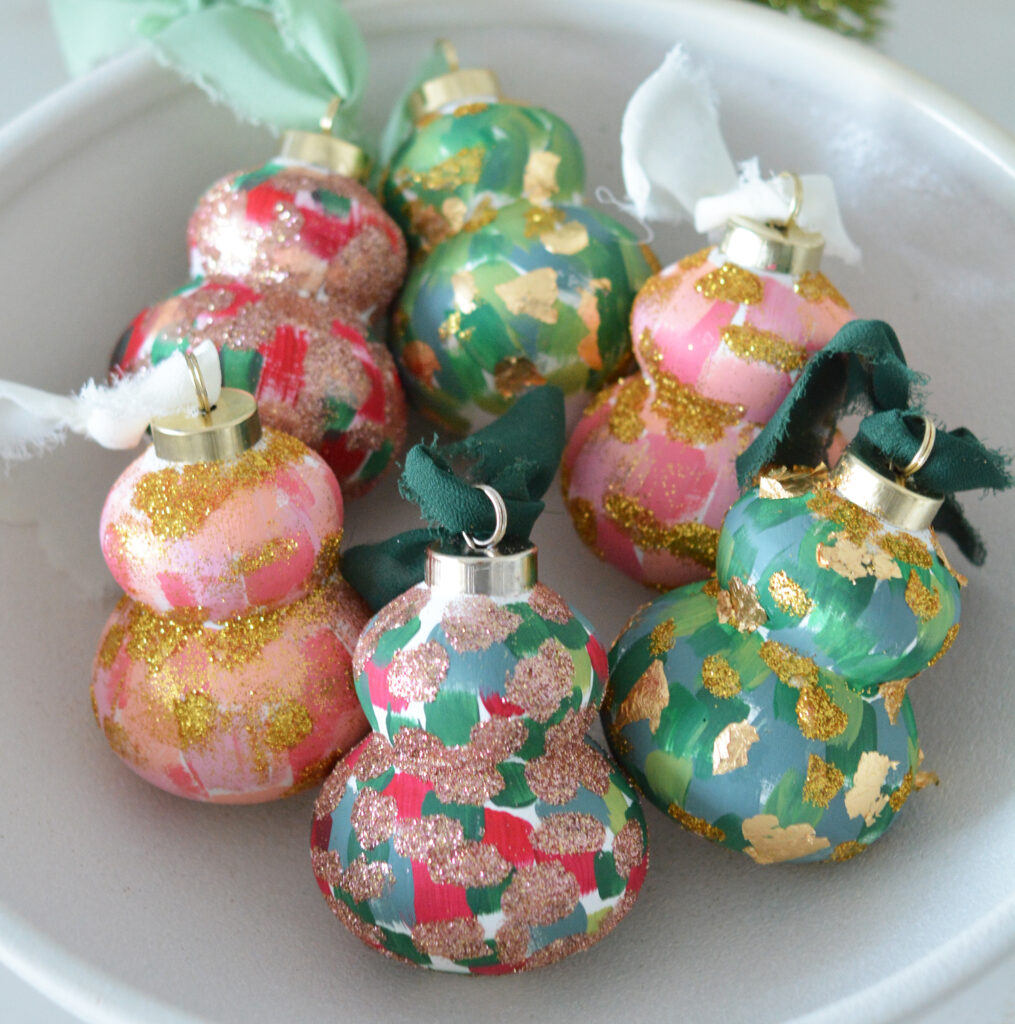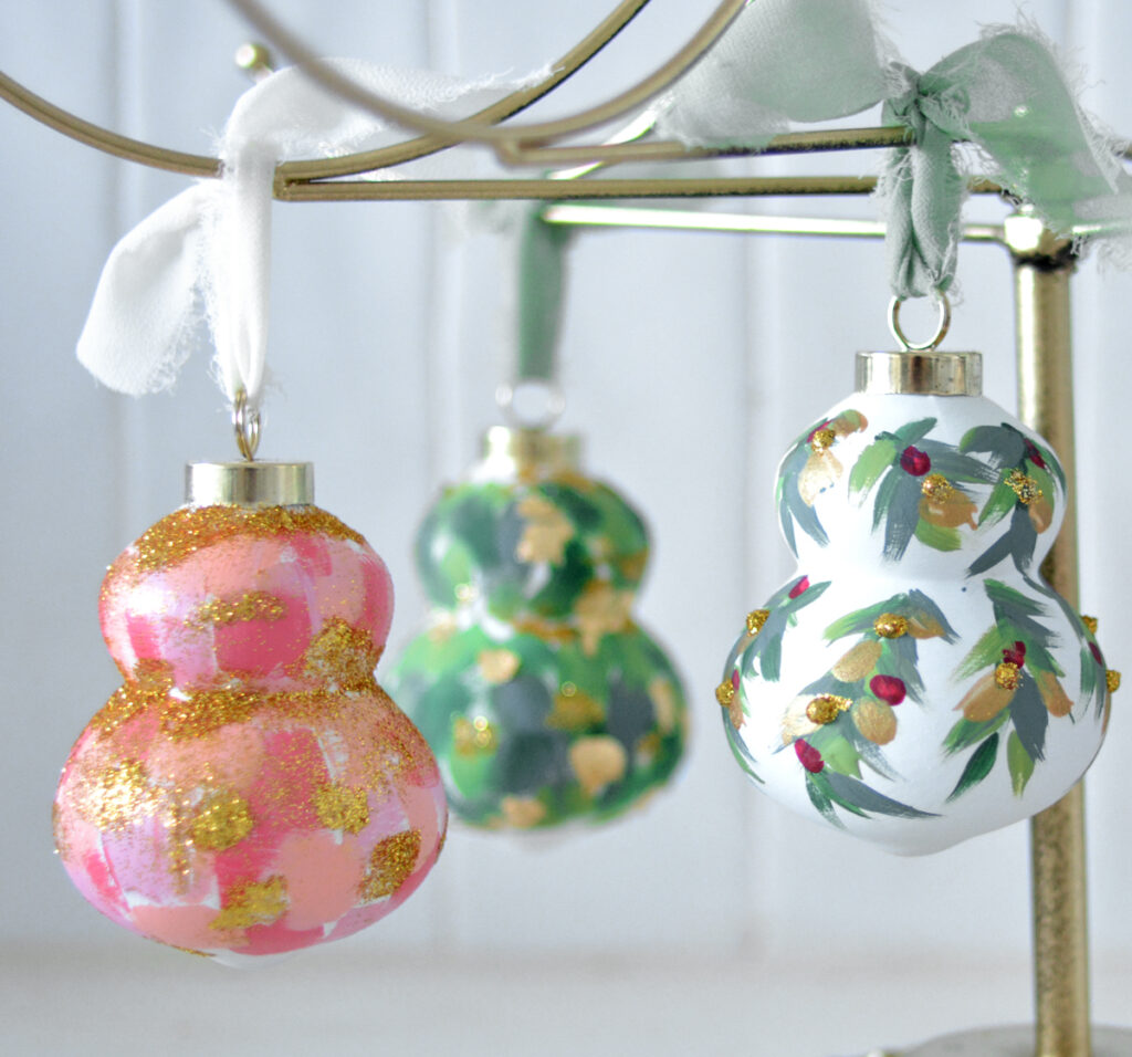 I used my stash of paints, glitter, and leftover gold leaf to make these, then added chiffon ribbon to finish them off.