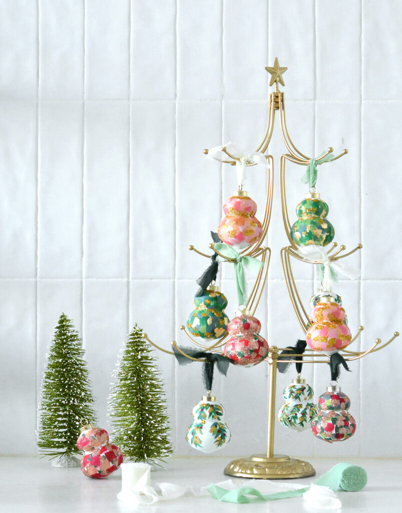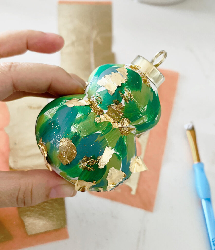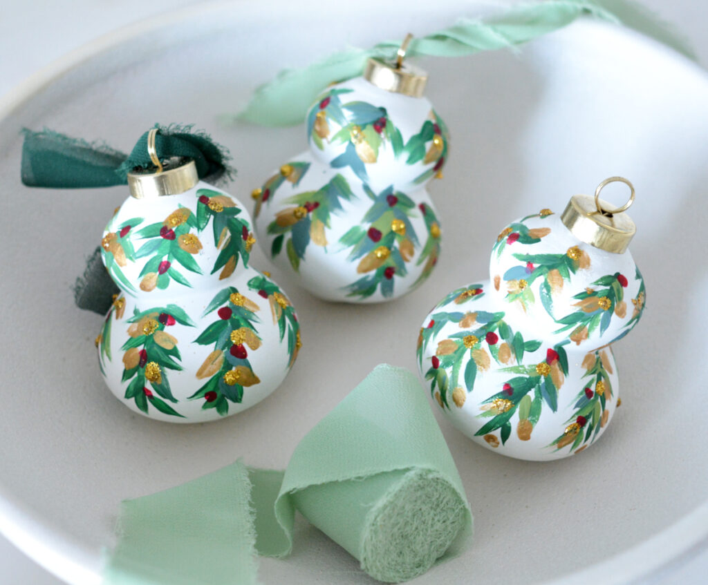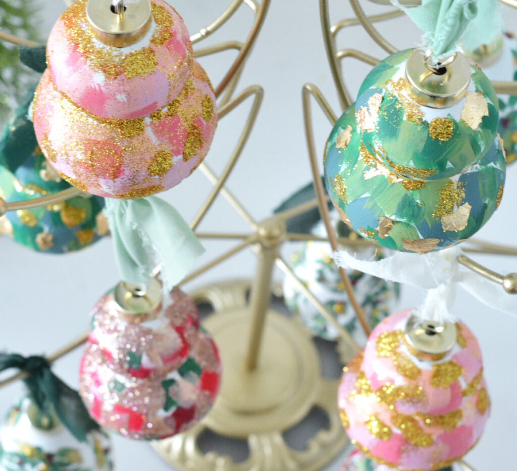 I used my stash of paints, glitter, and leftover gold leaf to make these, then added chiffon ribbon to finish them off.