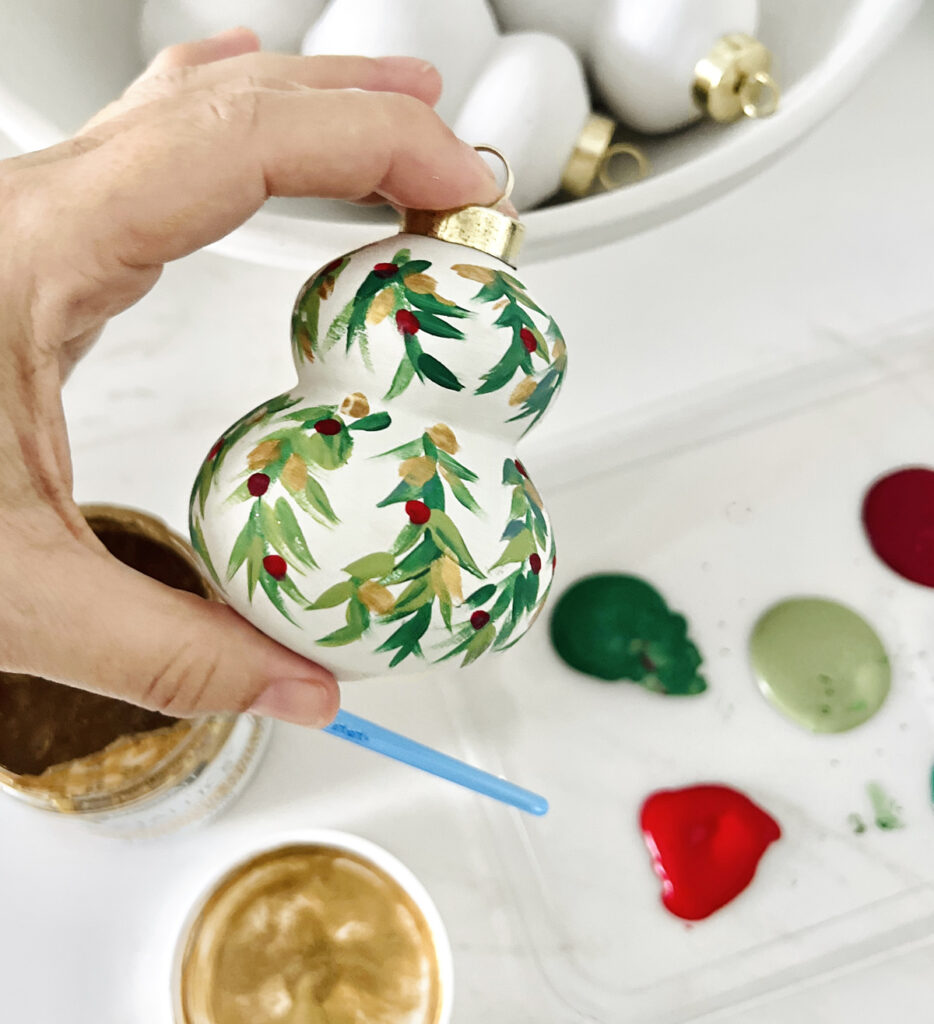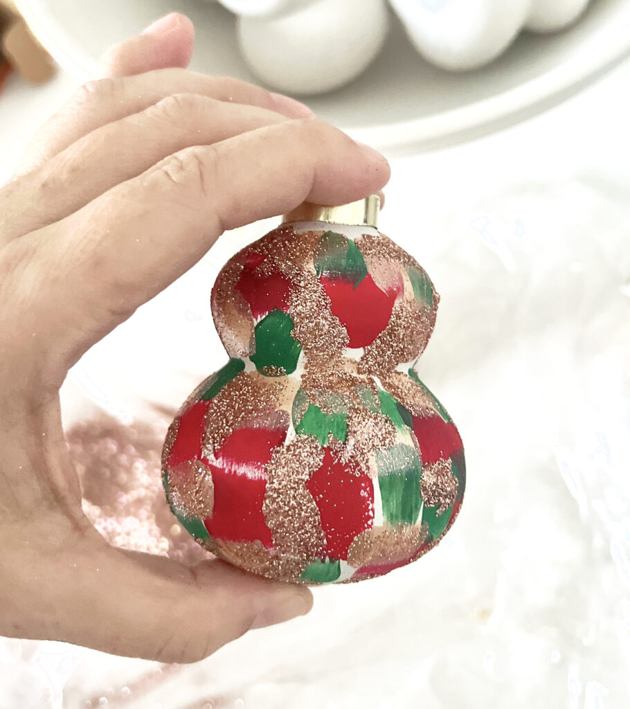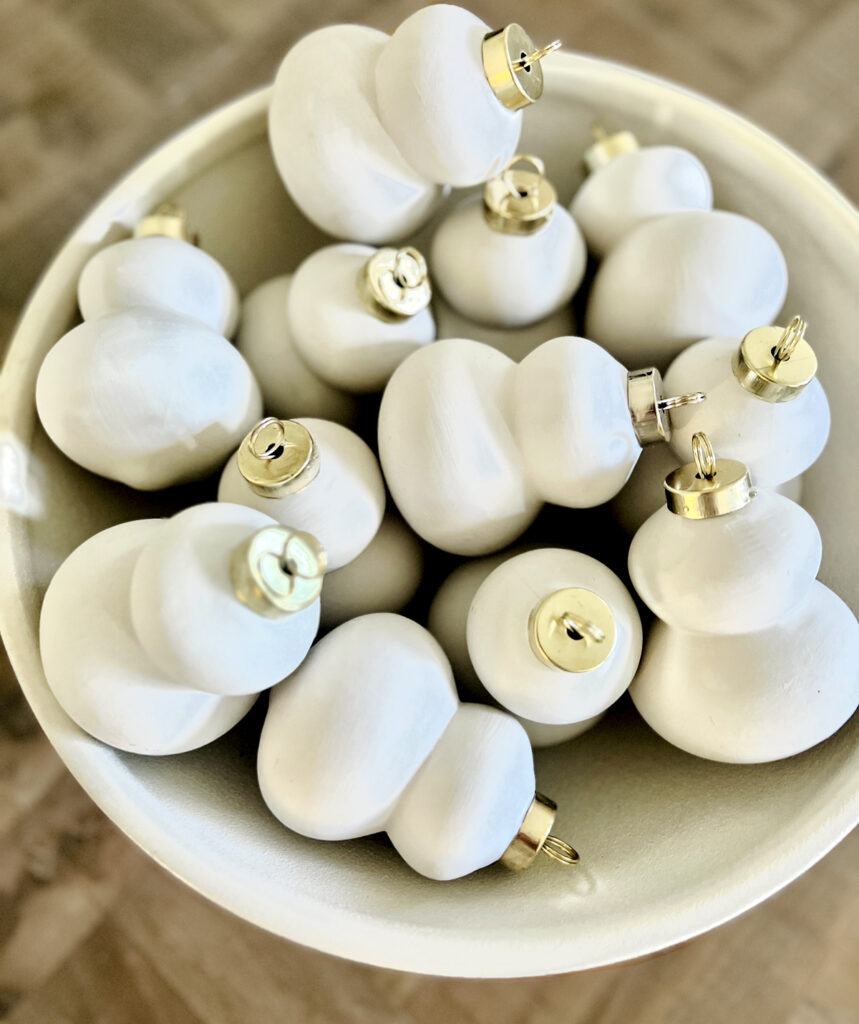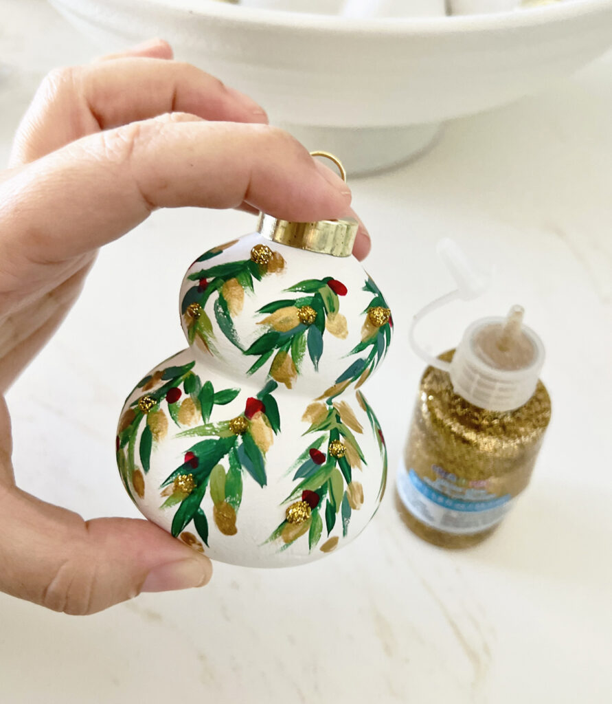 I really like the matte finish and shape of these ceramic ornaments but ‘tis the season to add sparkle and bling. This can be done in a few different ways, with glitter, gold or silver leaf, metallic paint, or a combination which is what I did.