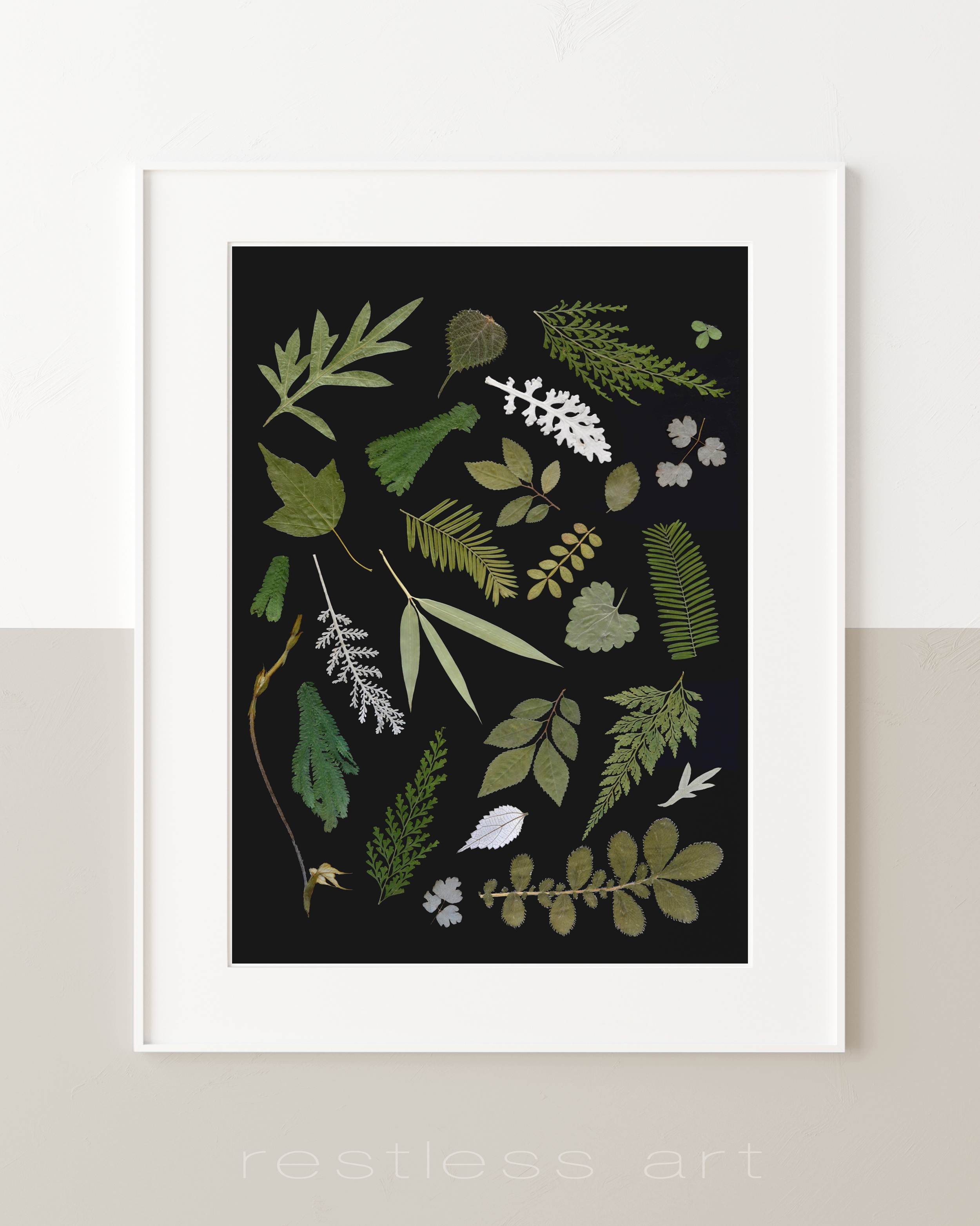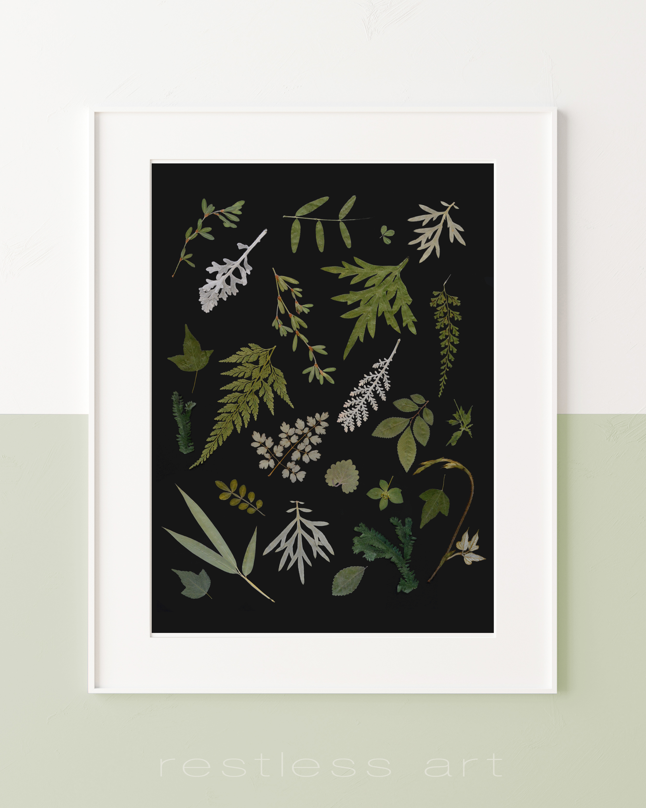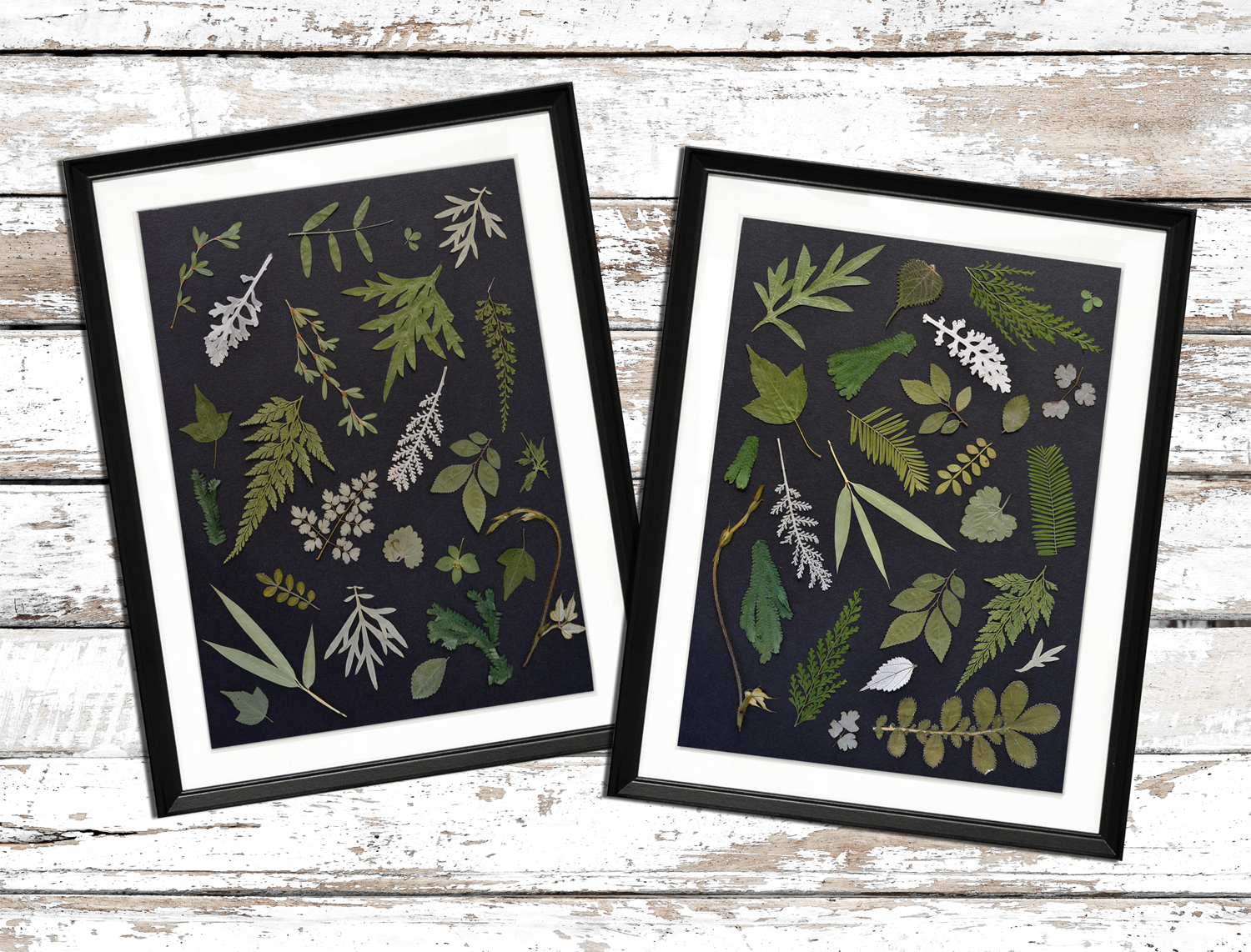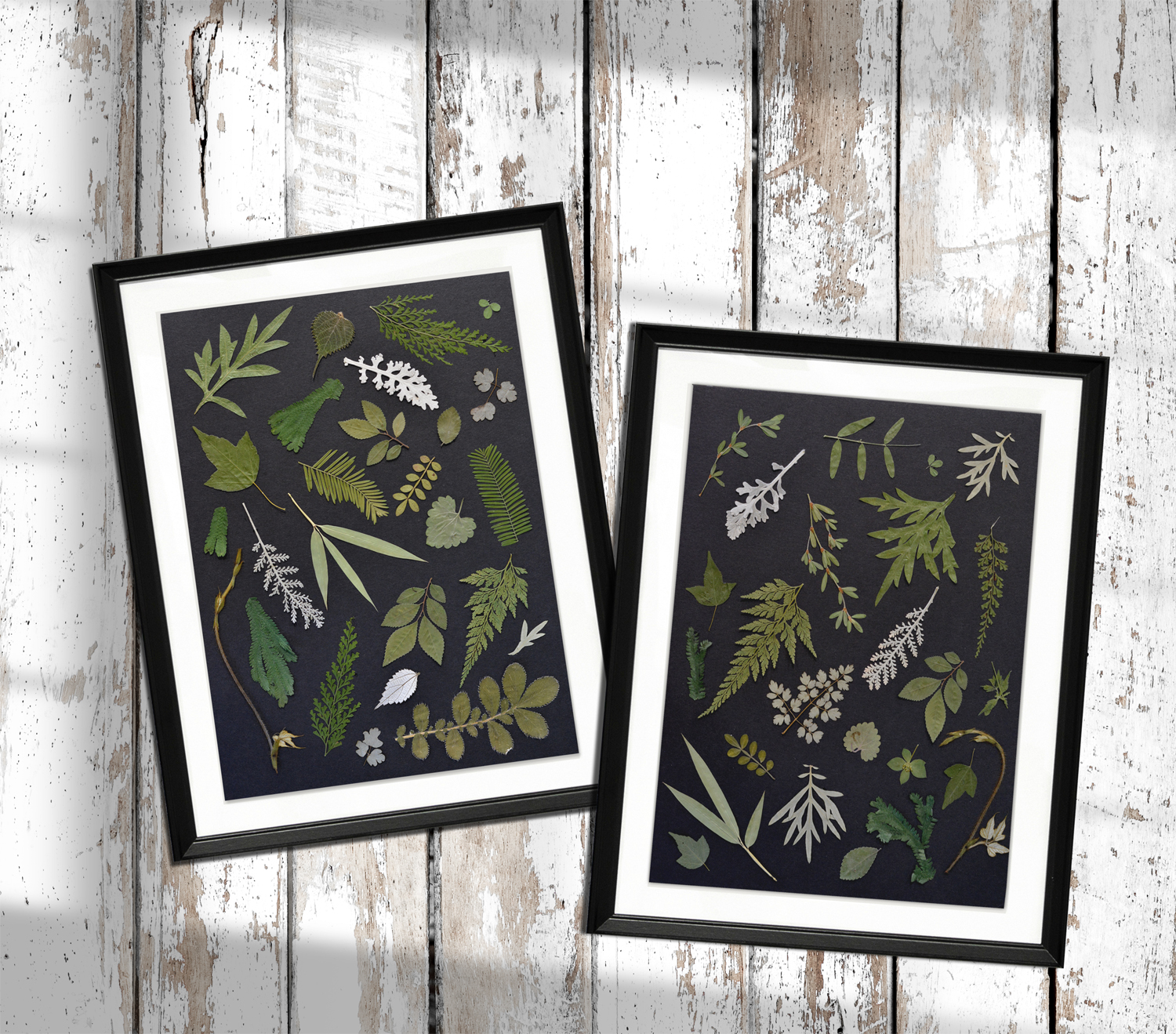 Pressed flowers and leaves have a classic appeal, so I thought I’d try my hand and making a few with green leaves on a black background. I’ve seen pressed flower pieces on Etsy with a white background or inside a clear frame. Black backgrounds highlight green botanicals so beautifully so I chose black art paper for this project.