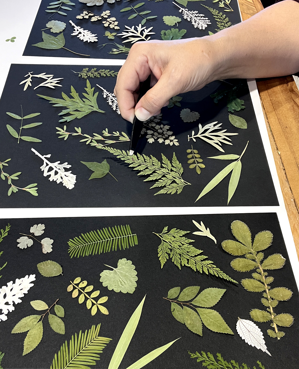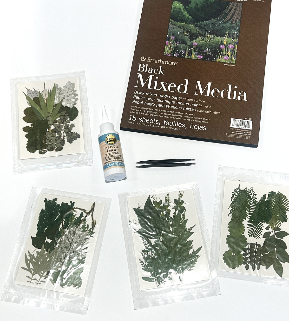 To create your own, the supply list is short and the steps are simple! You’ll need 9×12” black mixed media art paper (also available here); a set of pressed green leaves; acid free memory glue; tweezers; frame of choice.
