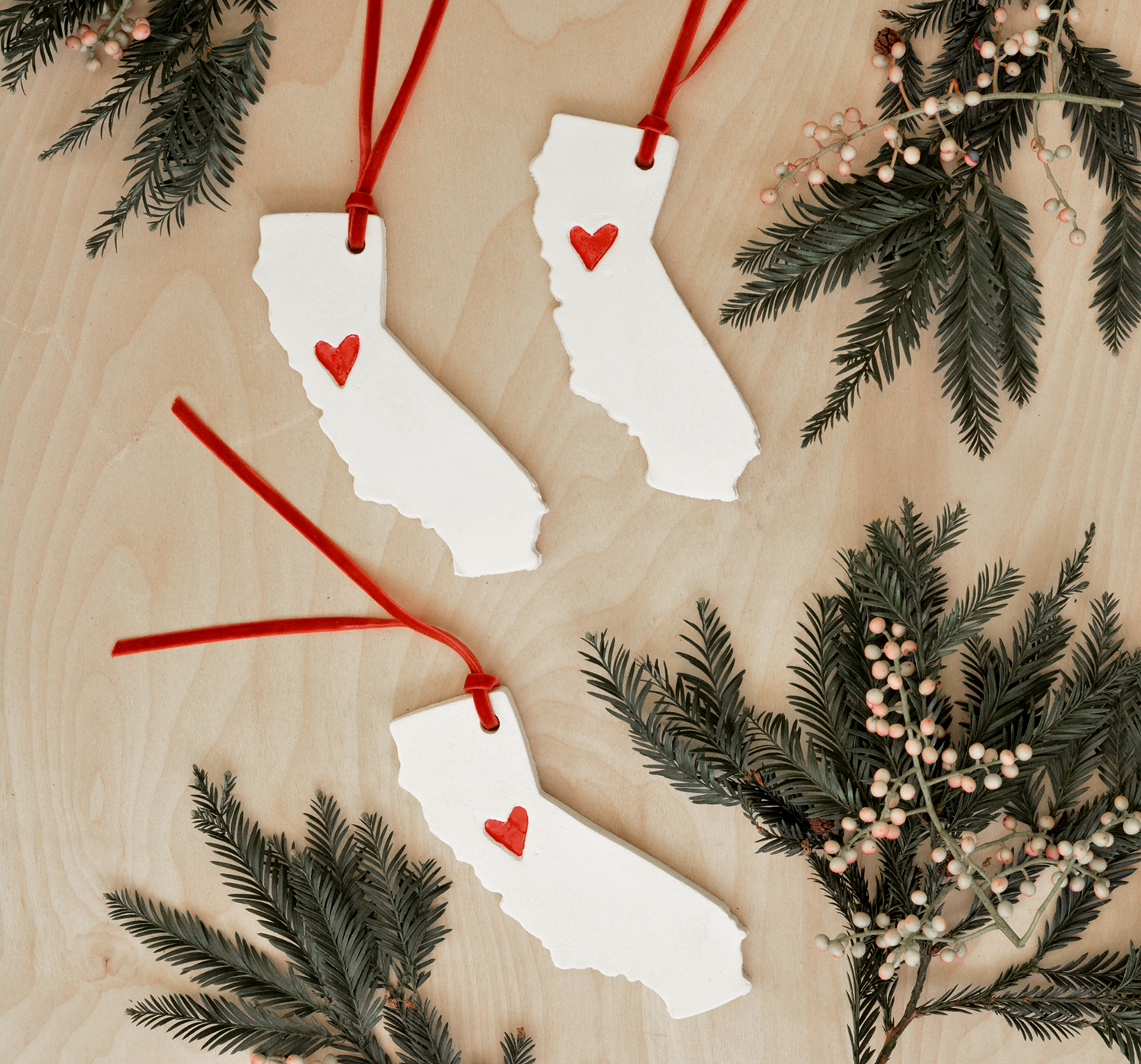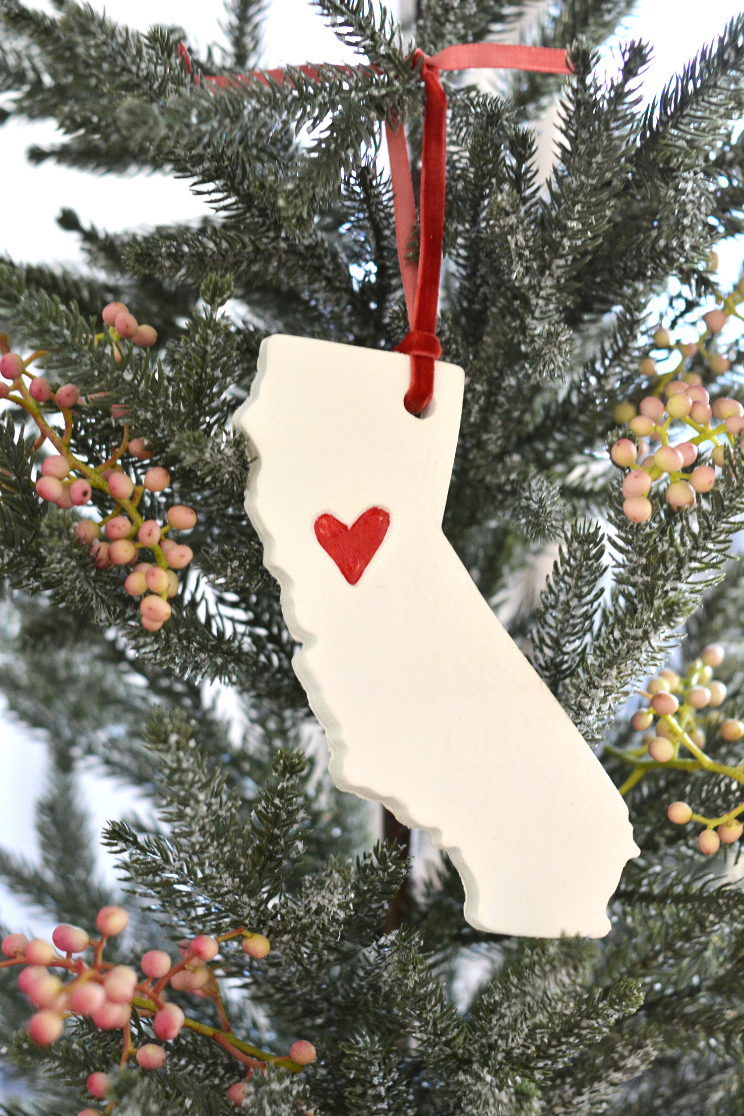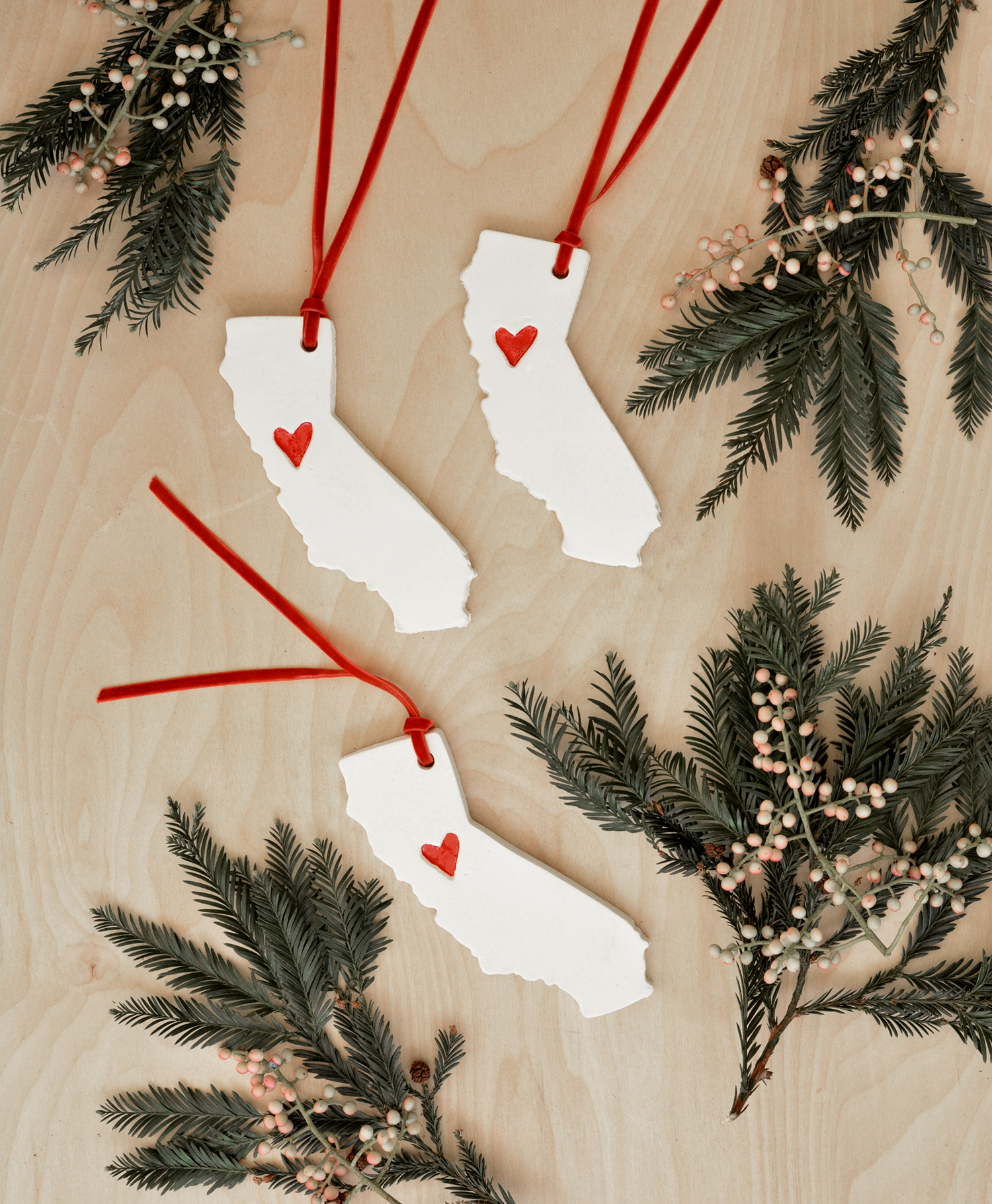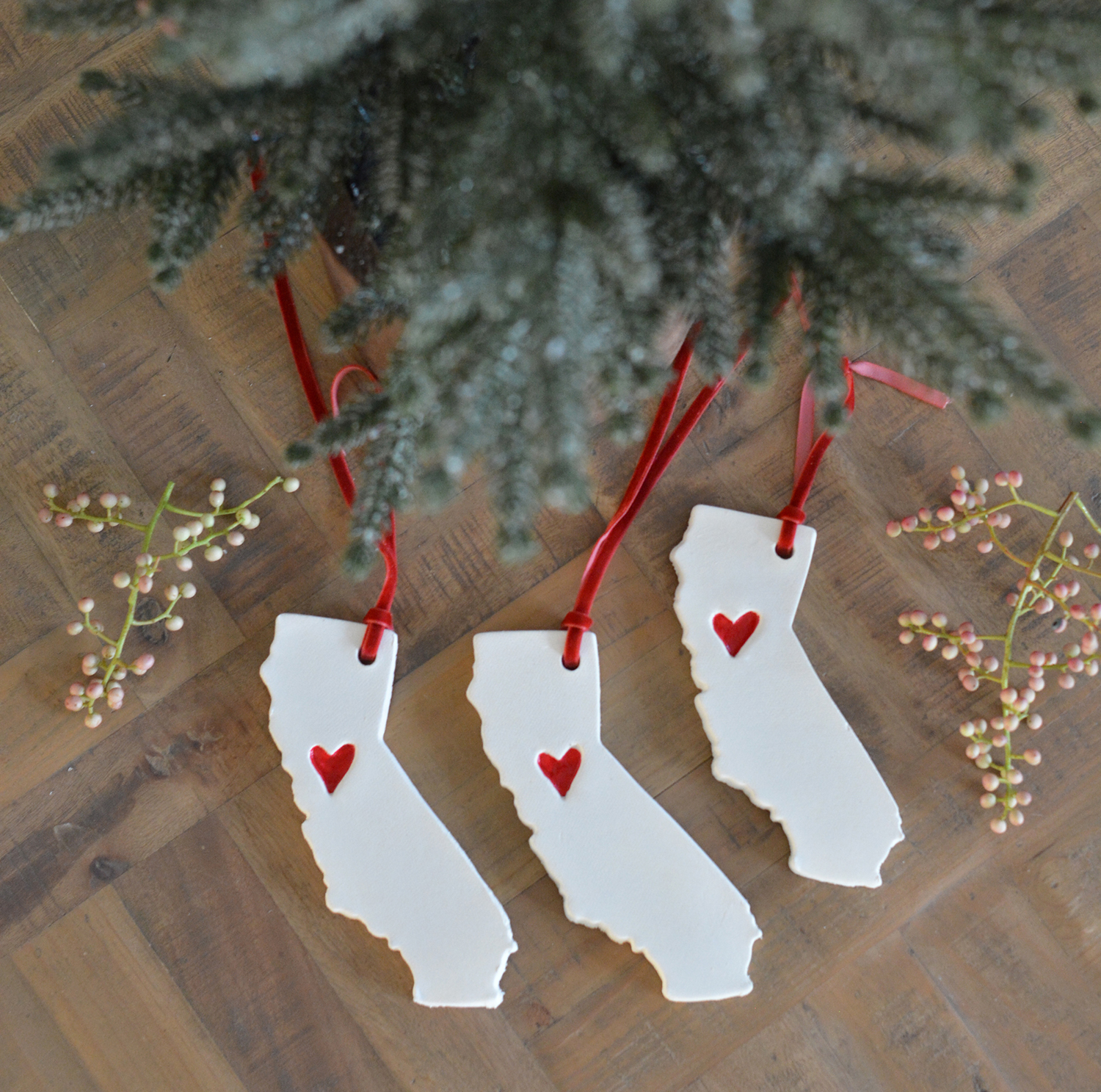 Several months ago I started making state shaped ornaments with raw clay at my ceramics studio for a local market where I’m selling art prints and ceramics in early December. Those ceramic ornaments were fired in a kiln, however I thought to myself perhaps I could recreate them with air dry clay for those who don’t have kiln access and the experiment was successful so good news, you can also make these with air dry clay!