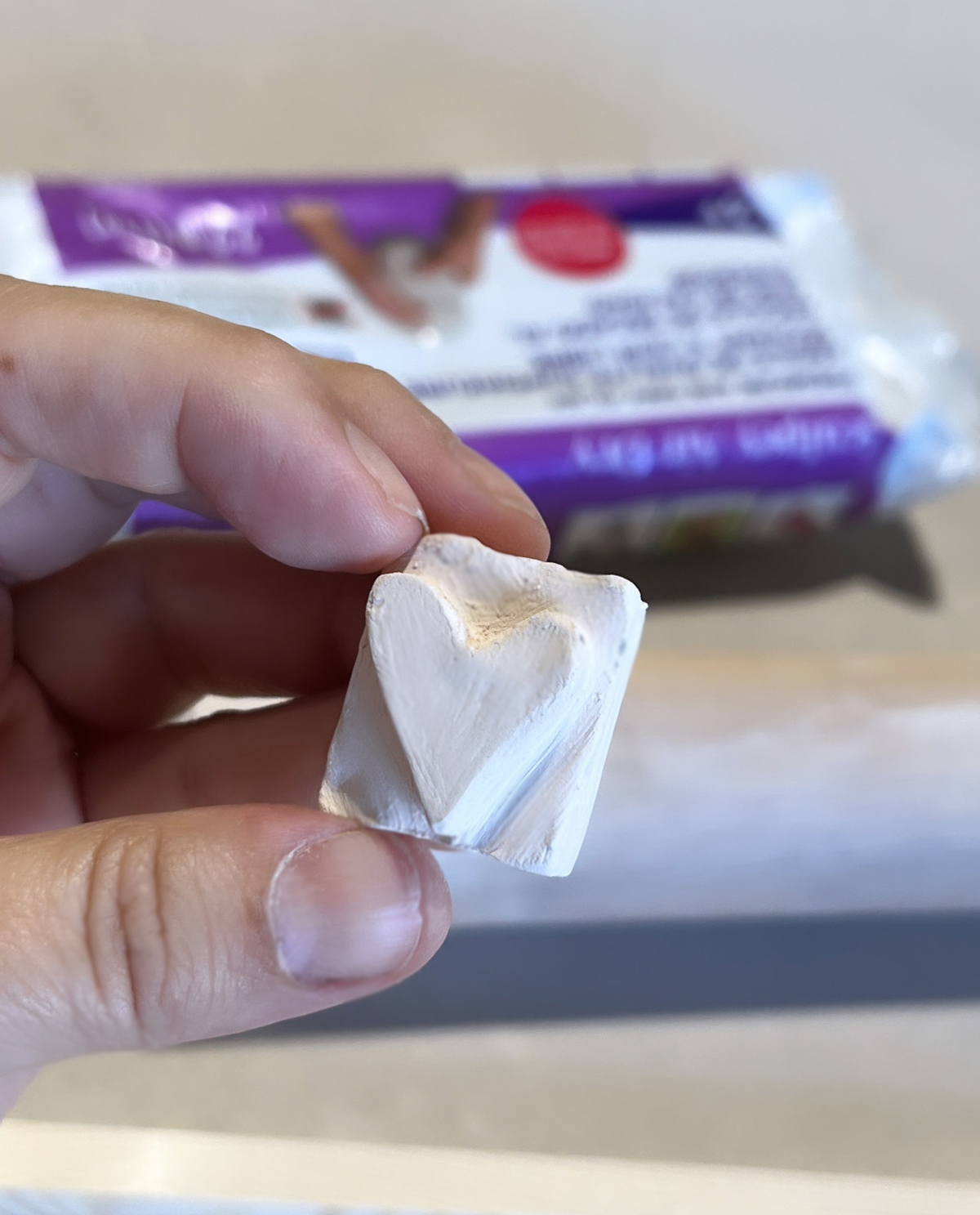 Step One: You have two options for creating the heart shape to imprint inside the state love ornaments, 1) purchase a small heart stamp, or 2) make your own stamp with clay first like I did. If you do the same, cut of a piece of air dry clay, form the shape and allow it to dry for 24 hours. Make sure to seal the remainder of the air dry clay so it stays soft while you wait for the heart shape to harden.