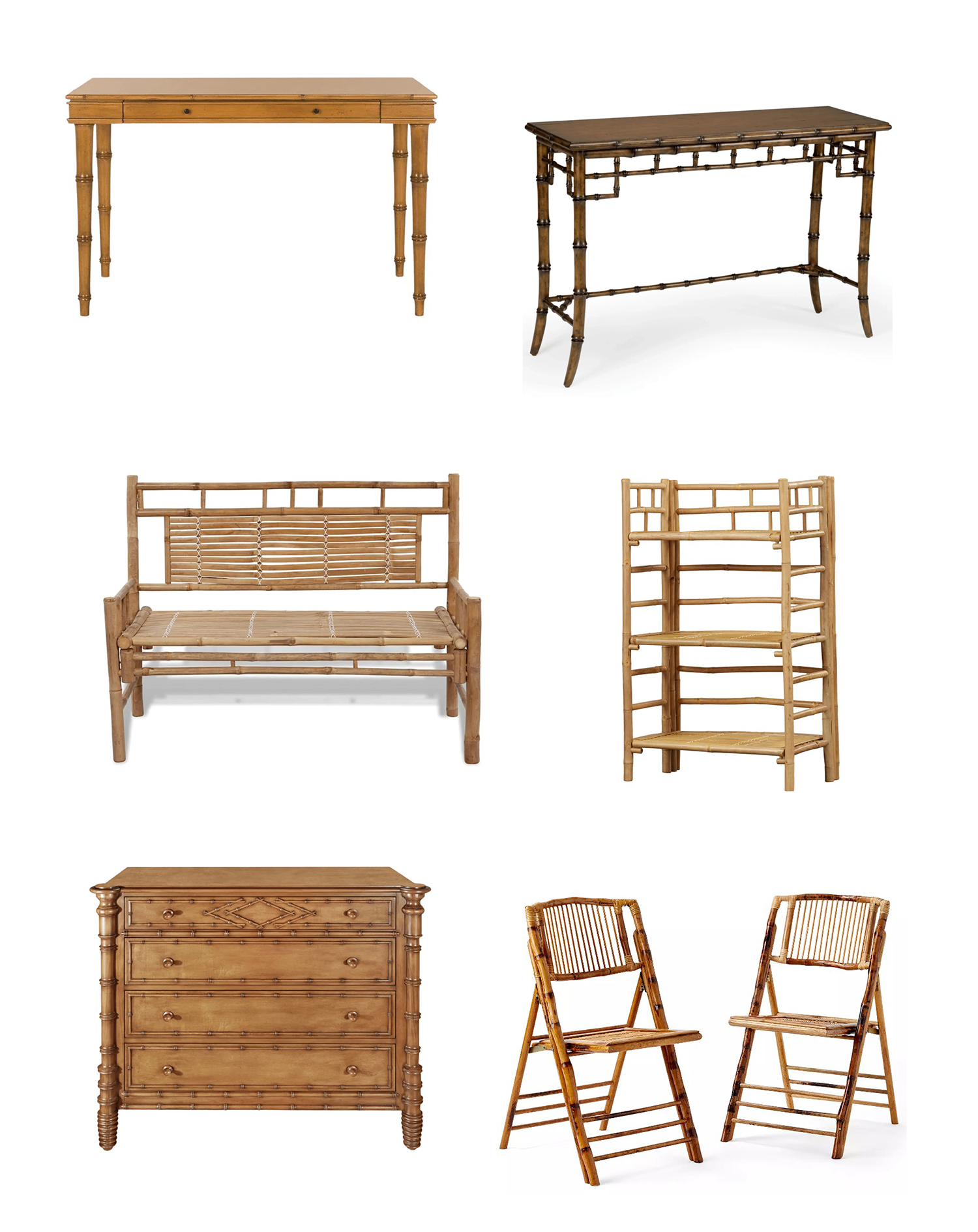 Since we bought a home by the beach in Florida I’ve grown increasingly interested in bamboo pieces, it must be the influence of the location. Bamboo is a sustainable source for furniture and flooring because it is a renewable material that grows rapidly. After it’s harvested it can also be manufactured into cloth or lumber. Left it its natural state it can be bent to form unique furniture pieces from the slender knotted hollow stems. Bamboo is different from rattan in that it grows vertically with hard stems, whereas rattan is a palm like bendable reed that can be woven.