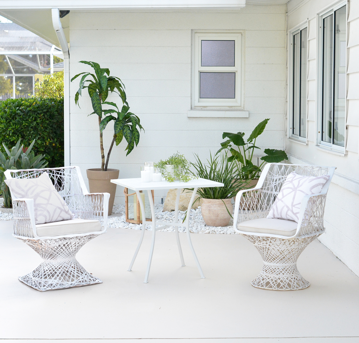 We’ve been slowly fixing up our house in Florida whenever we visit, and on my last stay earlier this month I gave the patio seating area a makeover. Anyone who’s lived in Florida is familiar with the weather patterns there: winters are sunny and mild, spring is perfection, summers are hot and humid, and it rains a ton in the fall. I didn’t want to tackle this project in high heat and humidity so I planned this outdoor update during the best time of year for it, and gave this corner of our patio a makeover while temperatures were in the mid 70s.