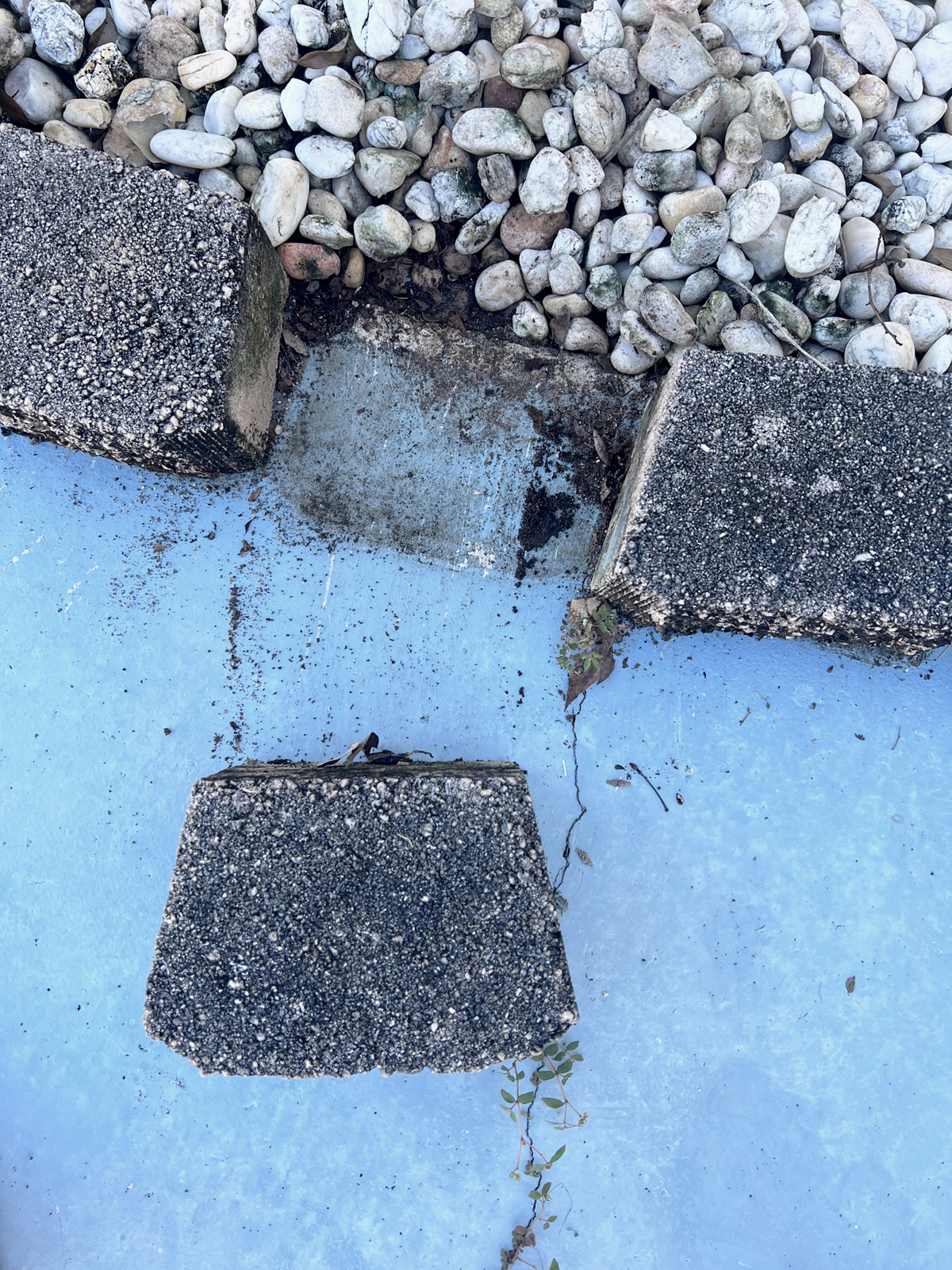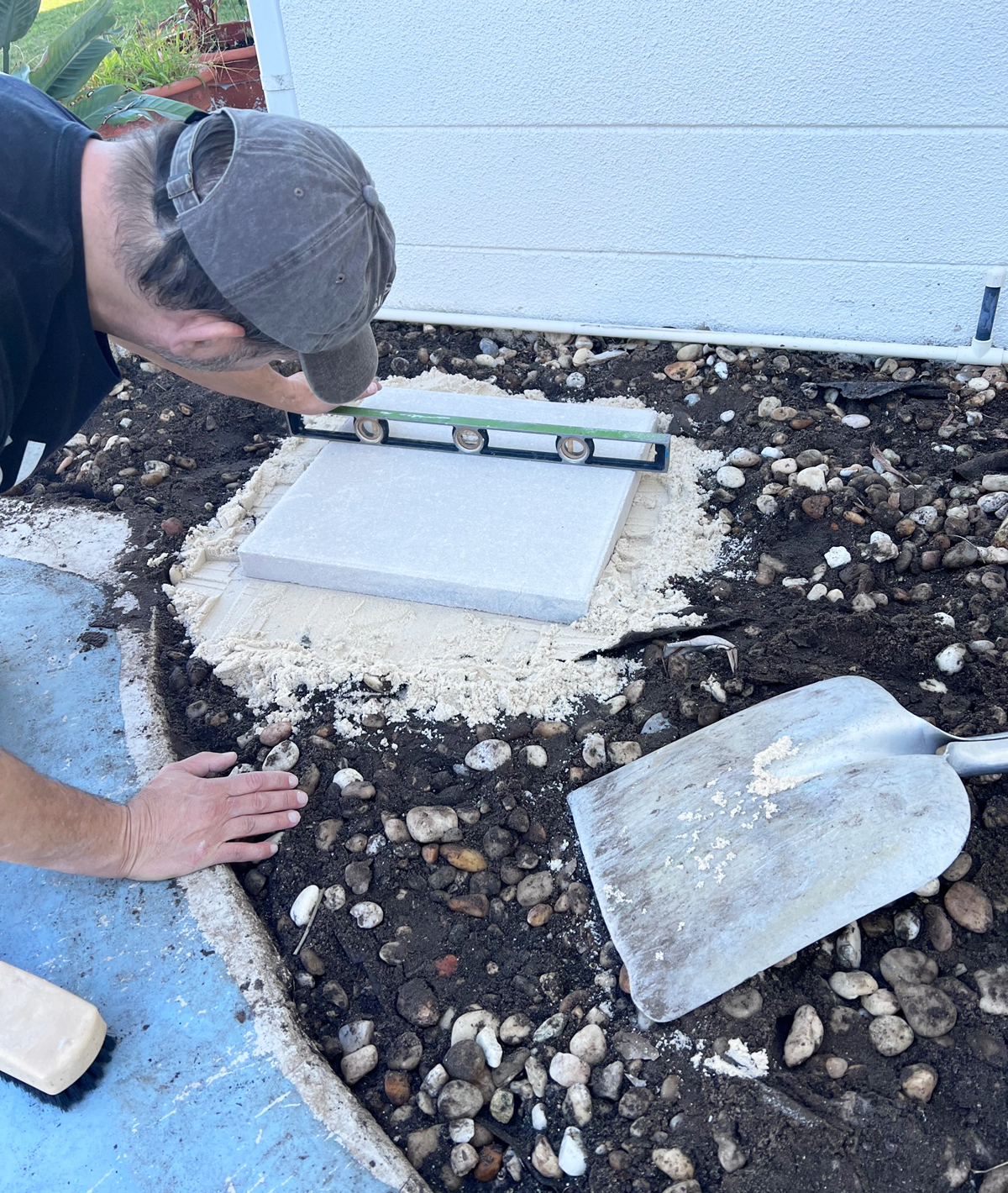 After 95% of the old rock was gone we brought in some sand to support new 24″ pavers I bought for a trio of potted plants to fill the space with greenery. I used extra sand to cover most of the existing landscape sheeting, hoping that will hold it in place.