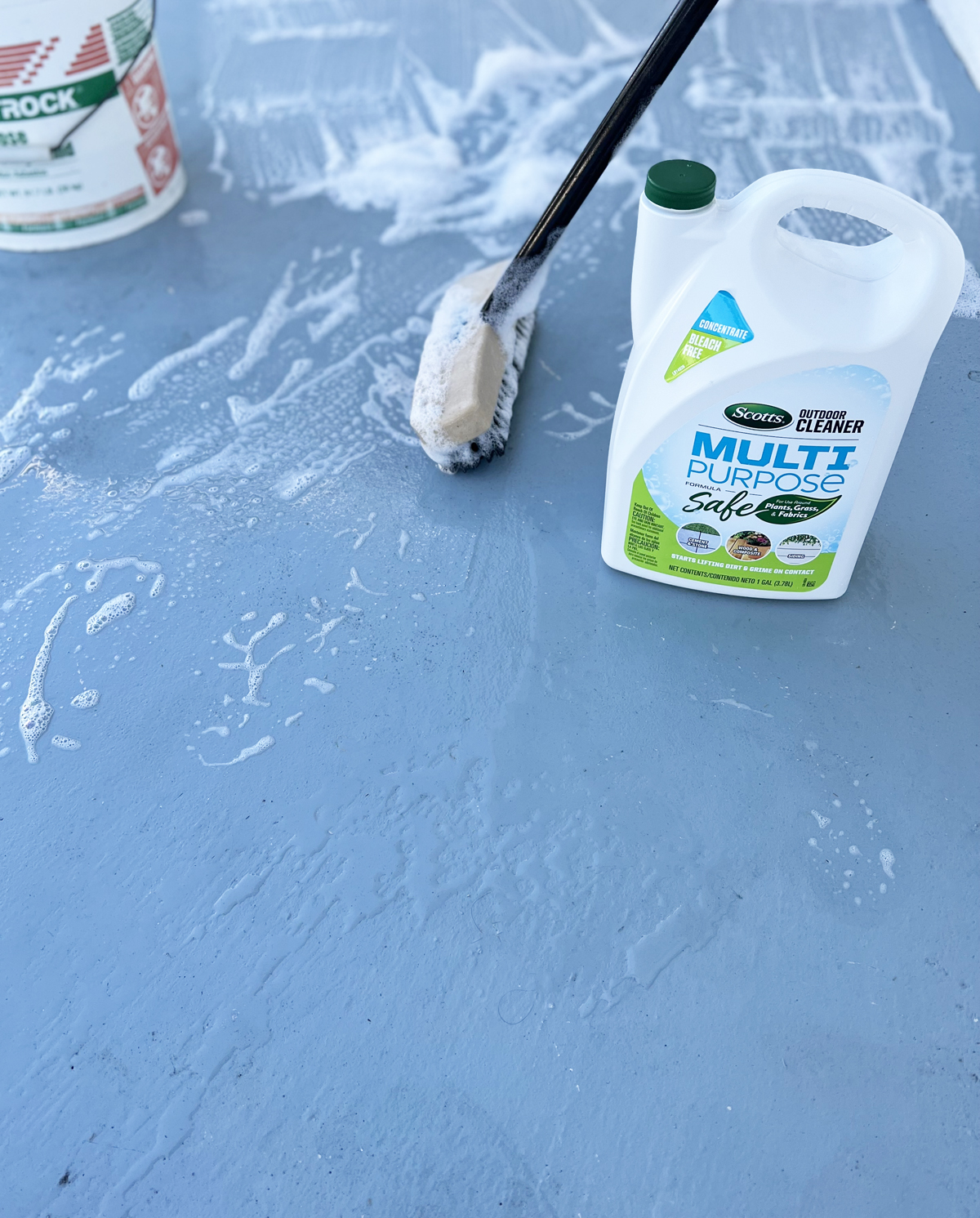 We bought 15 bags of white rock from Lowe’s and layered over the the sand for a fresher look. The last part of the makeover was to paint the patio. I power washed it, then used a cleaning solution to scrub and clean the surface.