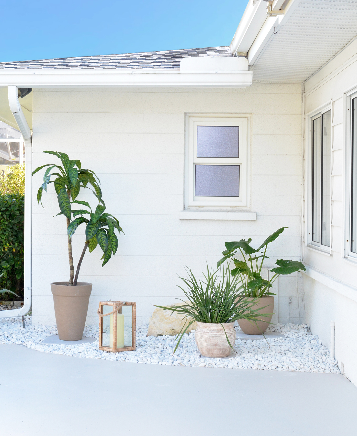 I wrote about pale pebble landscape design ideas last year in anticipation of just this kind of makeover. These kinds of low maintenance rock beds with tropical plantings are common in the area, they also complement the style of our older home so I refreshed our sitting area landscaping in a similar style.