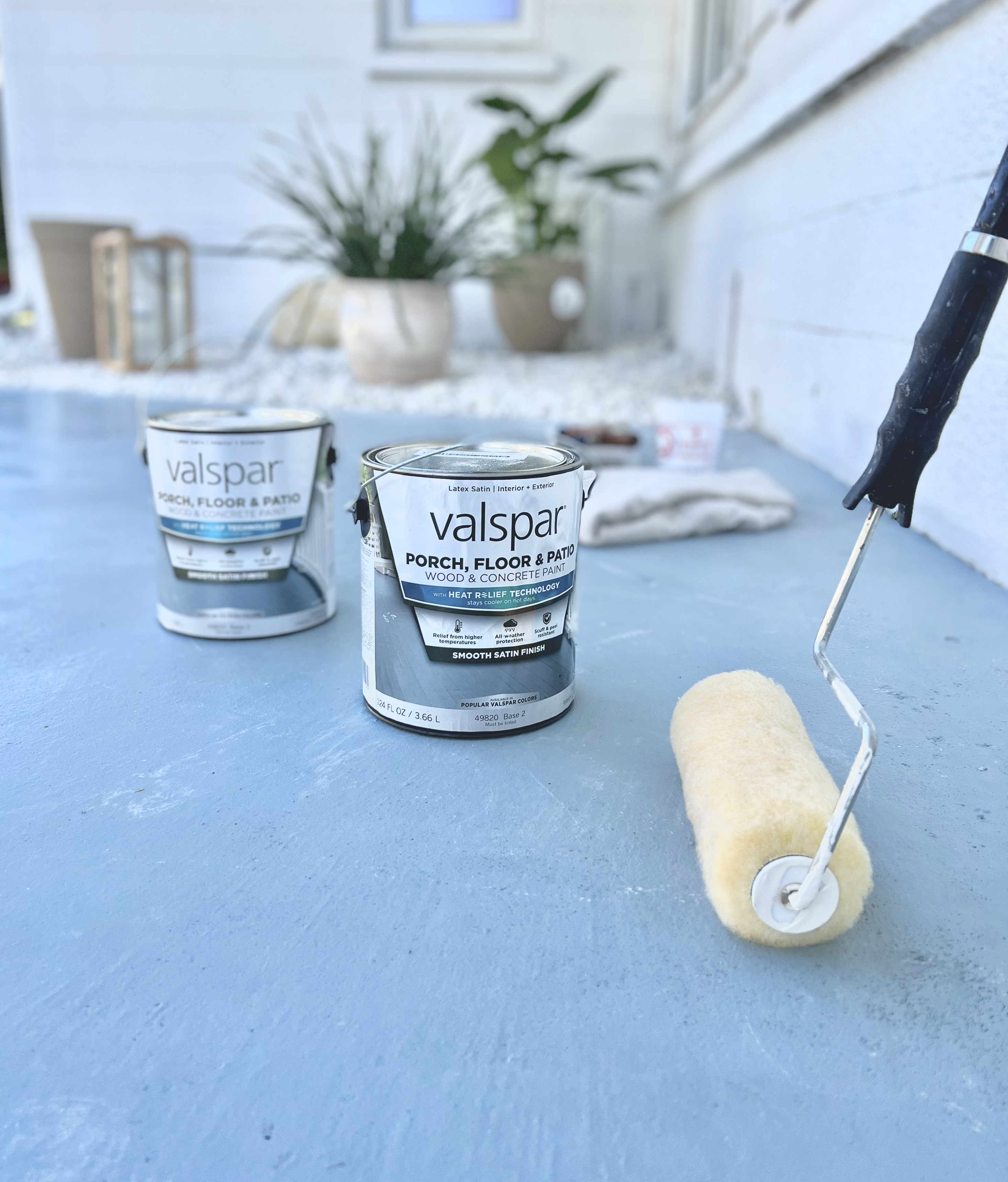 I allowed the patio to dry a full 24 hours then painted the patio with Valspar Porch & Patio paint in the color Beach Dune. I painted the edges first then the entire patio with a roller on a pole. I used one gallon for each coat allowing it to dry a full 24 hours between coats.