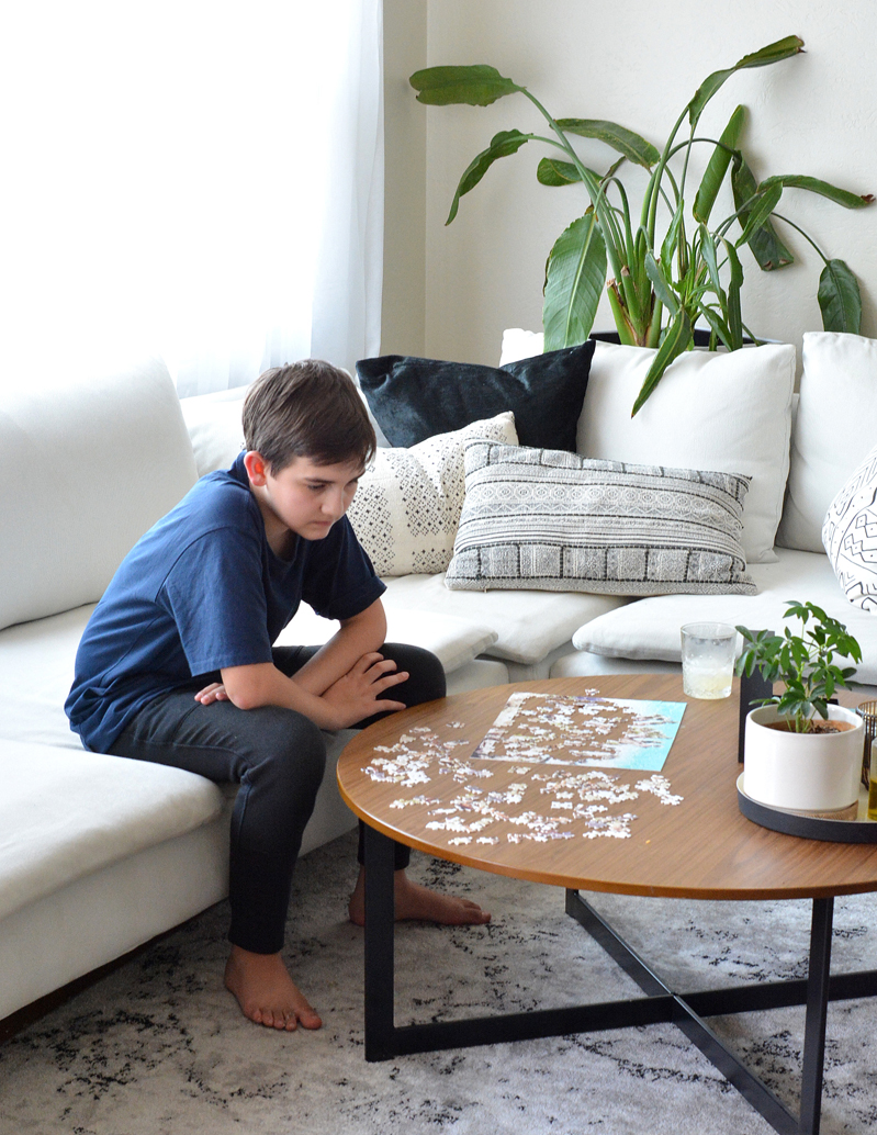 My son and I like doing puzzles together. We do crossword puzzles in the car, and jigsaw puzzles a few times a year. There’s something very calming about putting a puzzle together and we’re always talking each other through it. With his school schedule online, I like when he hangs out with me at lunchtime, we eat together and work on puzzles for half an hour.