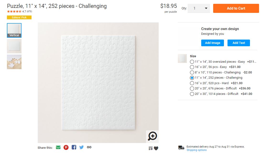 It’s very easy to make your own jigsaw puzzle. There are a few companies that will do it for you. I use Zazzle a lot because their templates are really easy. They offer a few template sizes to make your own puzzle, from simple to difficult.