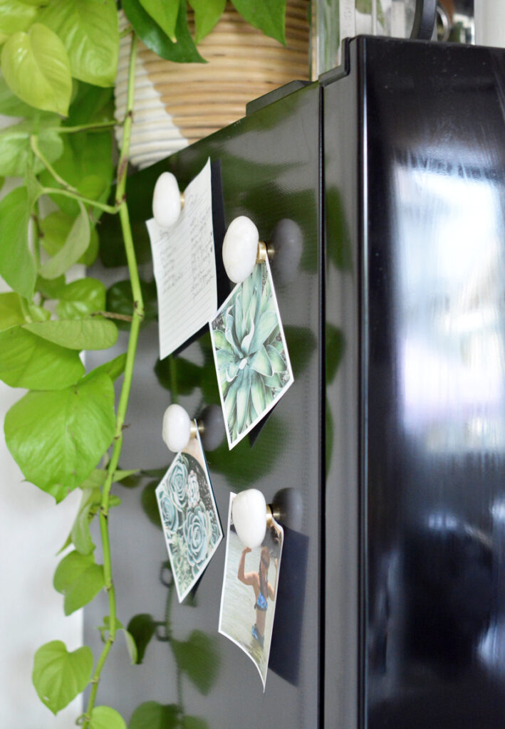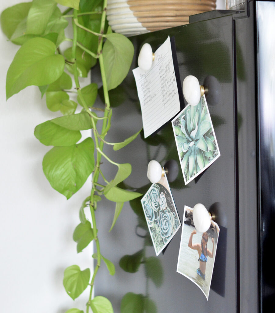 I’m always looking for ways to bring more natural or organic materials indoors. I ordered some polished river stones to cover some roots on my indoor tree but I set a few aside so I could use them as magnets for my little black refrigerator in the small kitchen in my studio. I love smooth river rocks, they feel so good to the touch! I once used a shower in a Hawaiian vacation rental and it had a mosaic river rock floor and I never forgot it. River stones are so soothing!